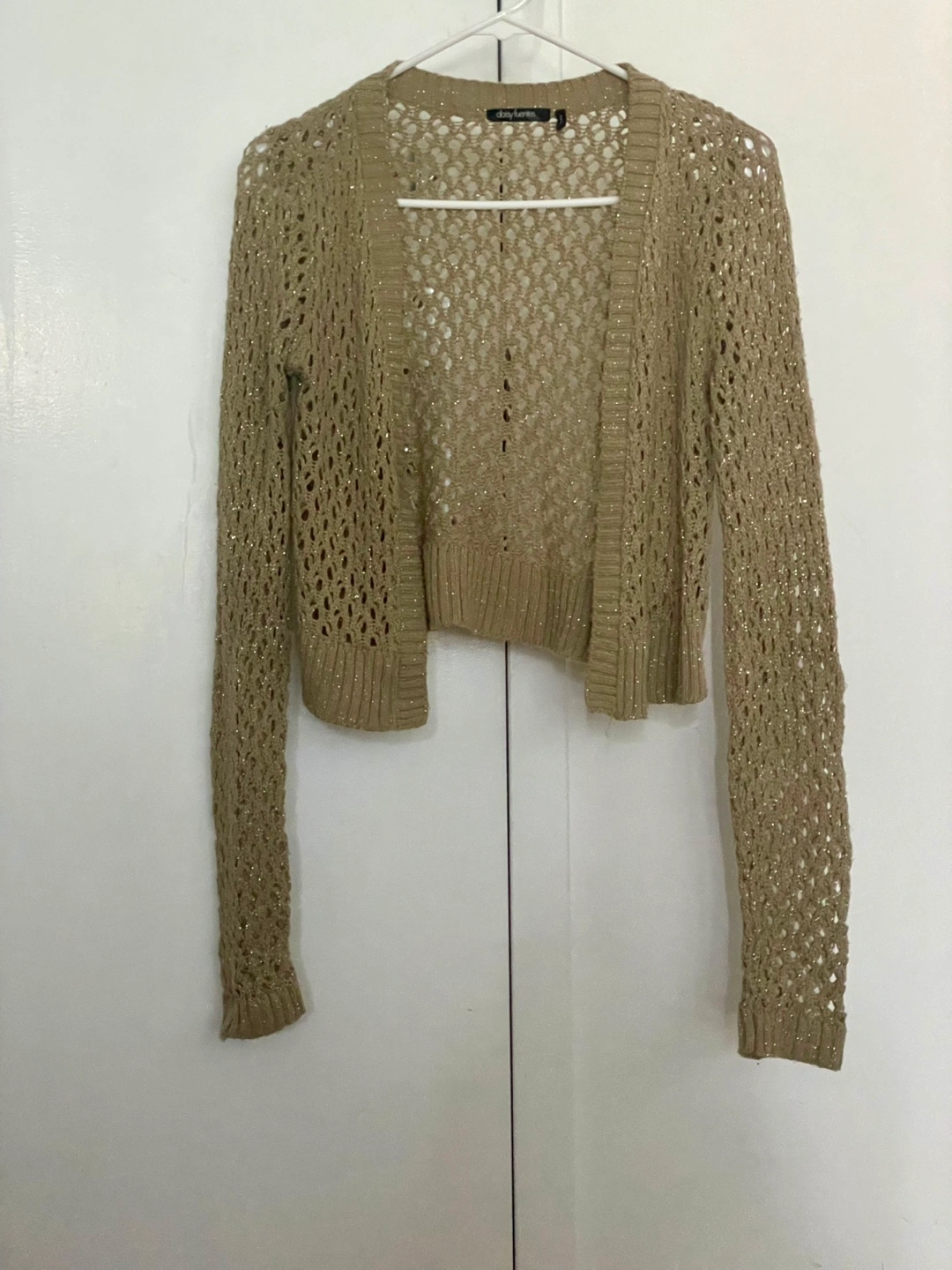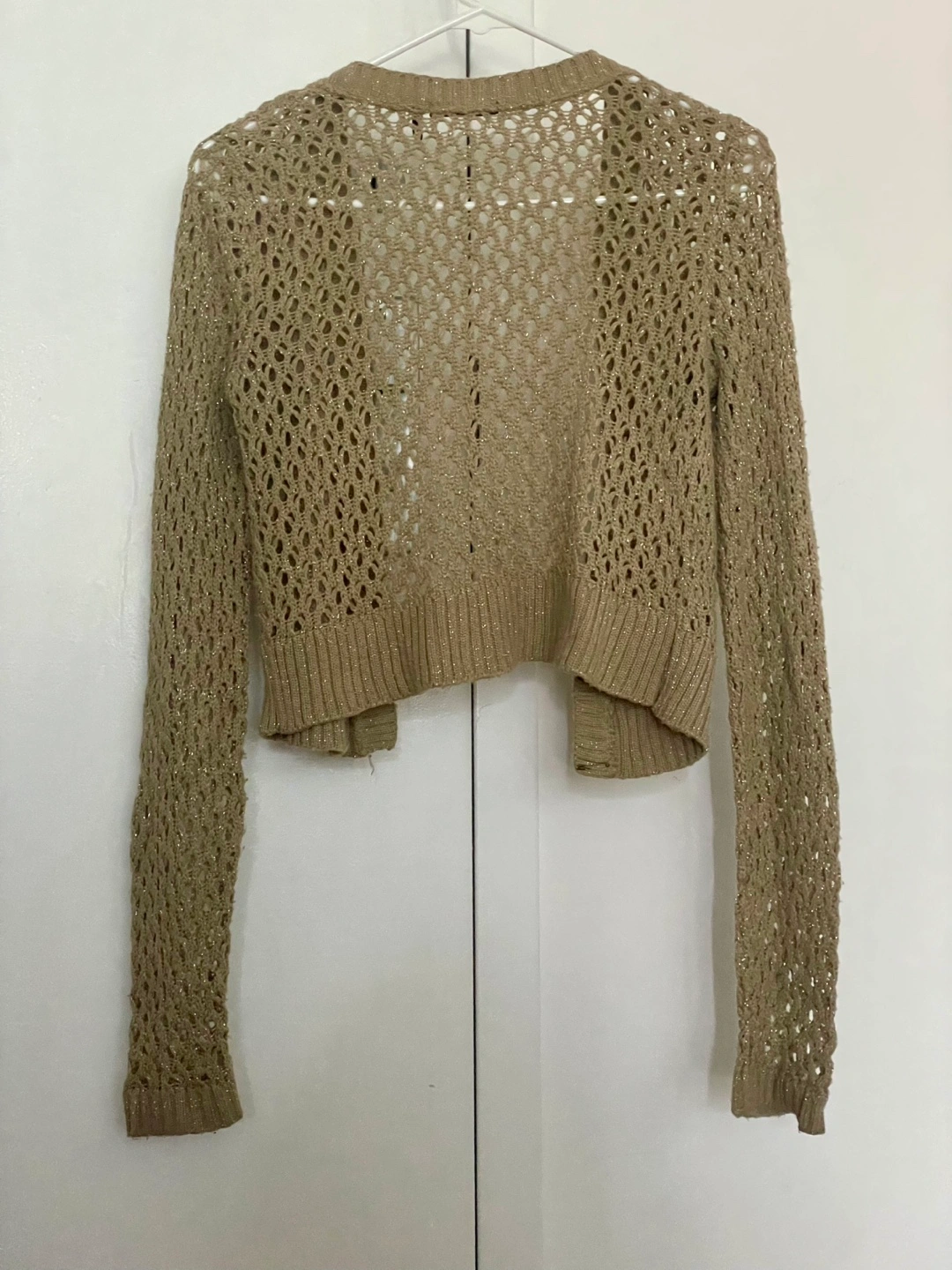 Very well kept, crochet cardigan. Beige with sparkles of gold material. Great for putting something light over your shoulders or complete and outfit