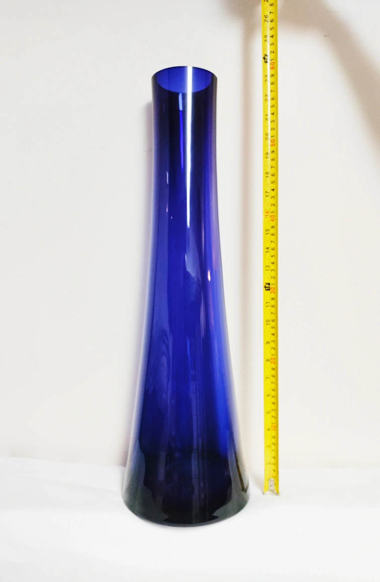 Beautiful tall dark blue glass vase. Elegant design. Approximately 24 inch tall. Perfect for a centrepiece or home decor.