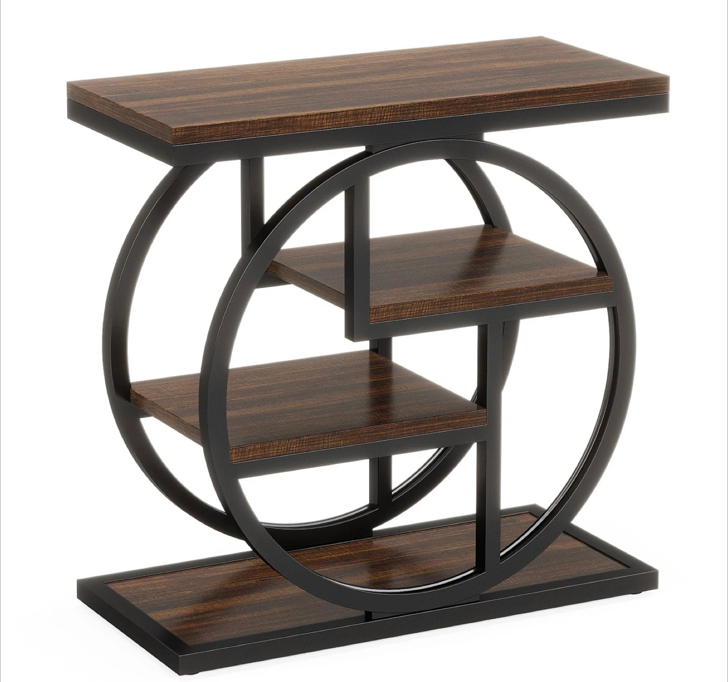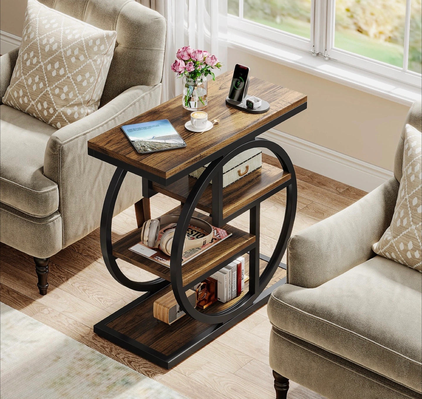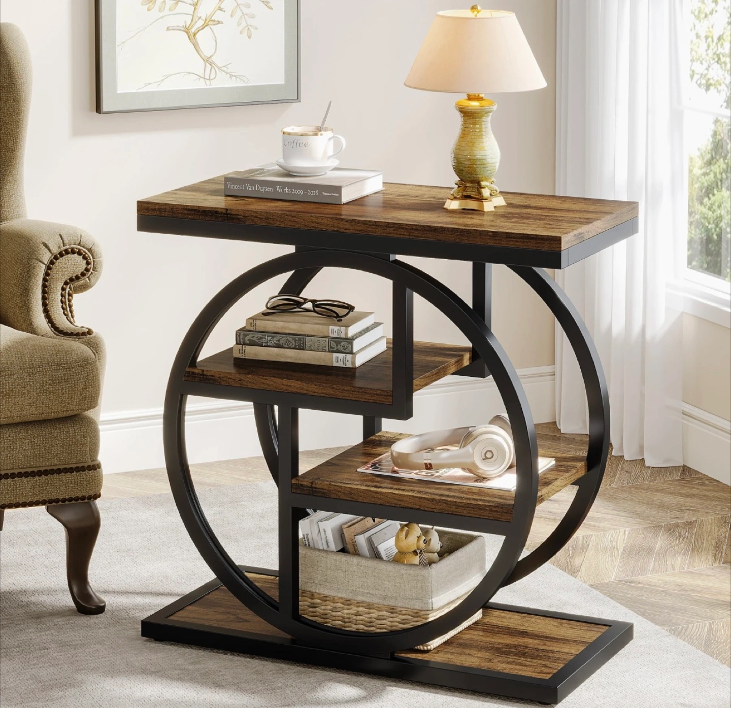 Unique end table. Features a wood top and black metal frame. Multiple shelves offer storage solutions. Perfect for living room or bedroom.