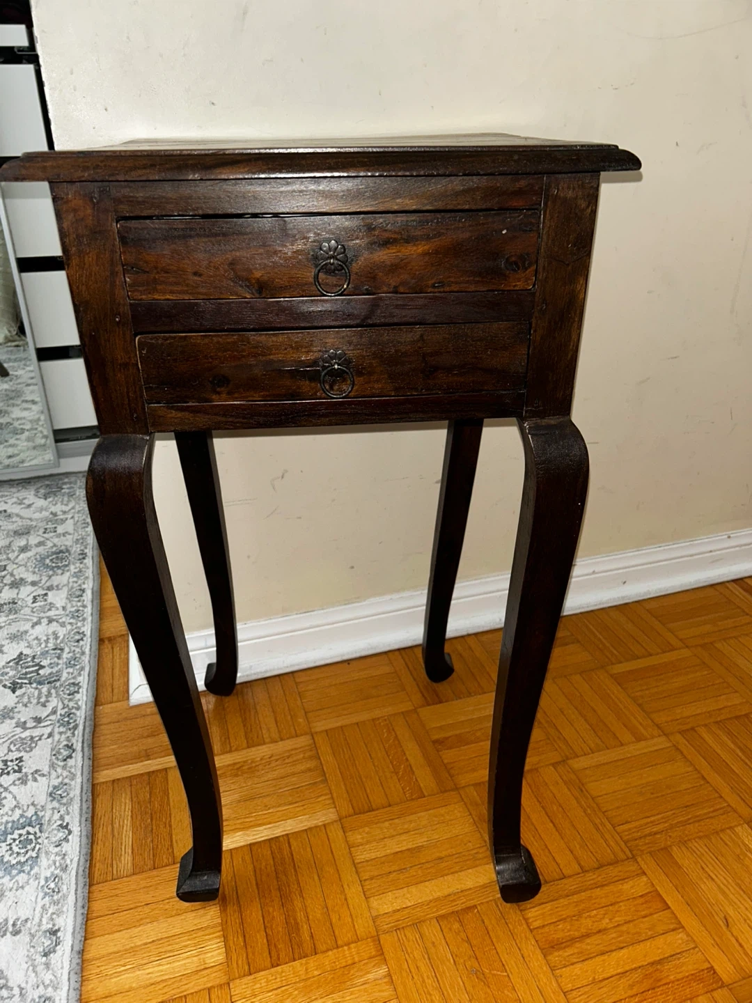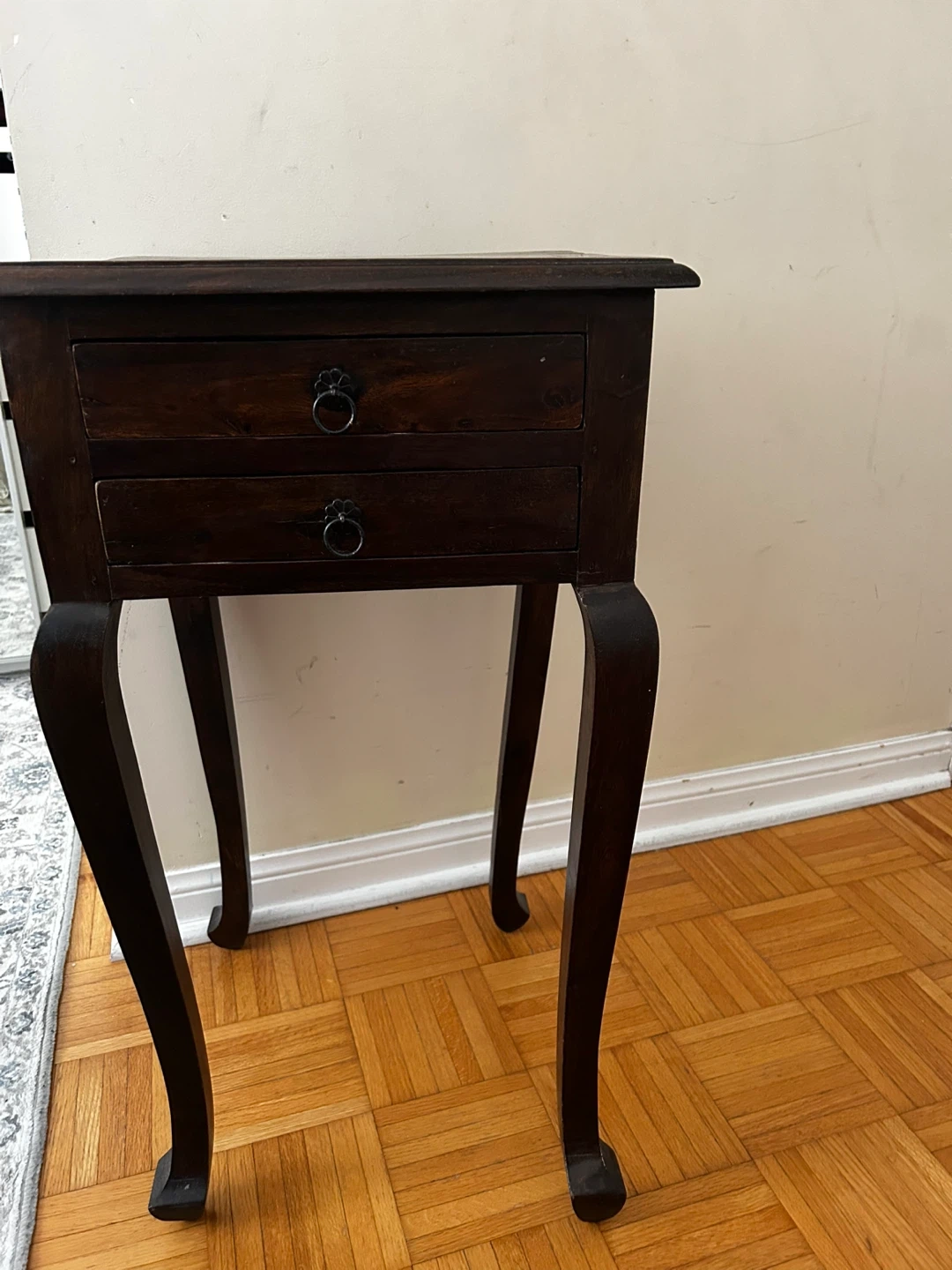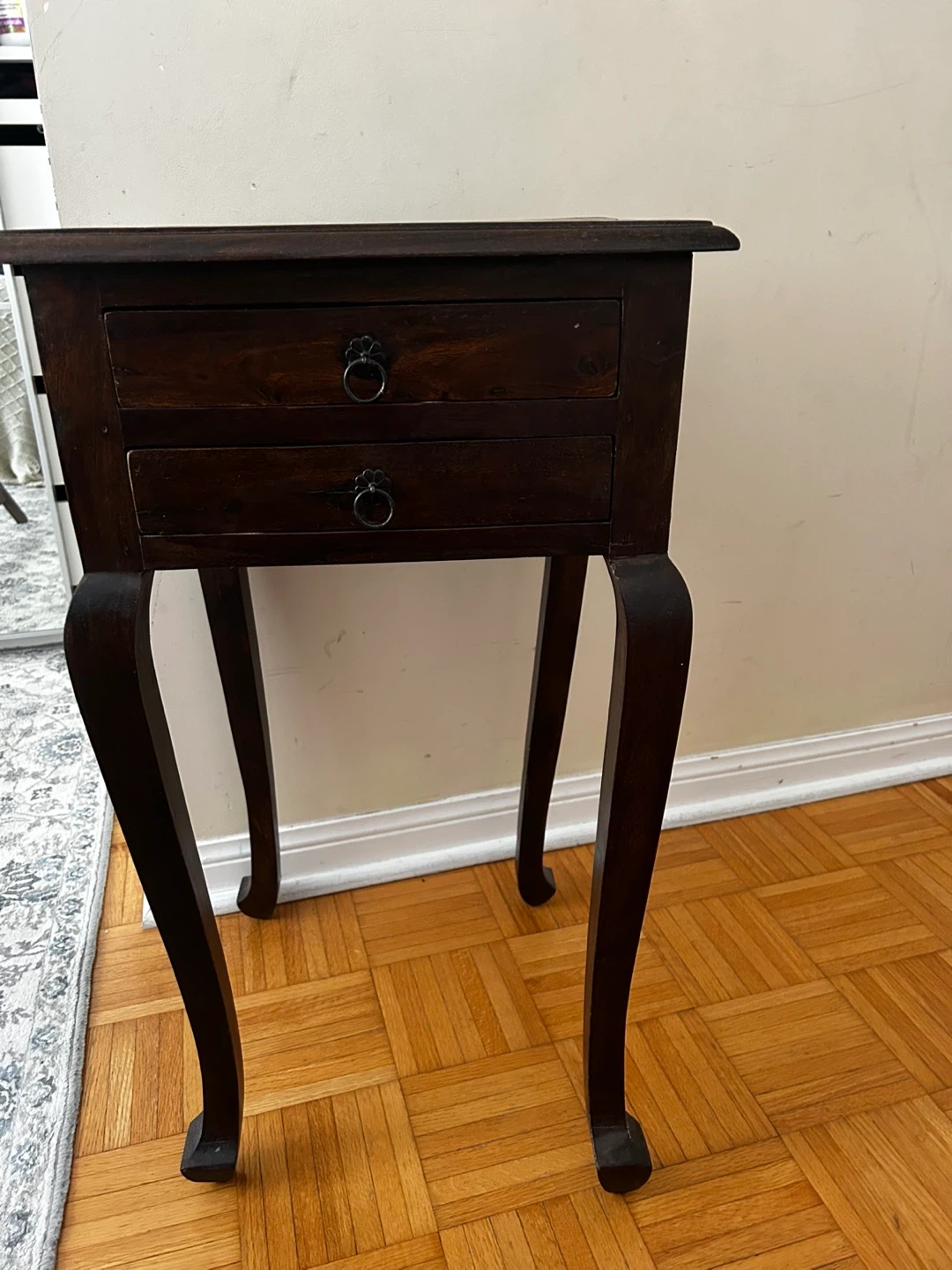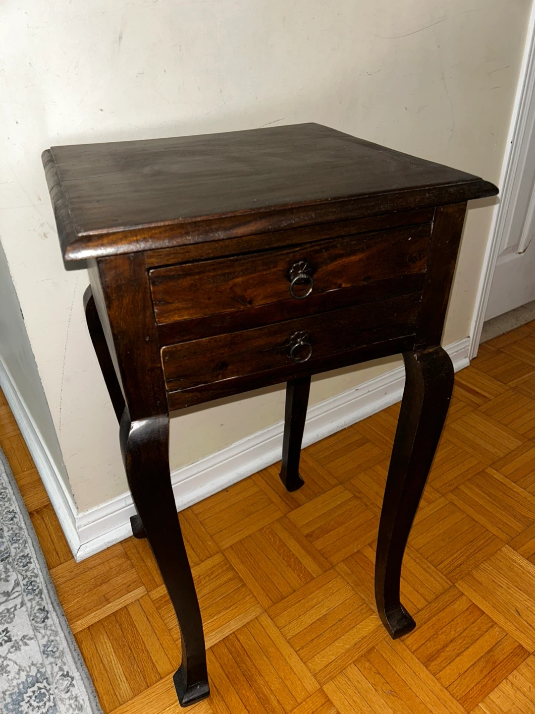 A dark wood side table featuring two drawers with ring pulls. It has a classic design with curved legs. This table's compact size makes it handy for various spaces. I have set of 2matching tables $40 each set $80