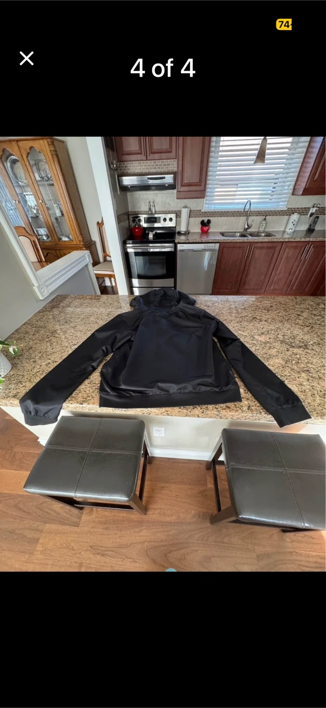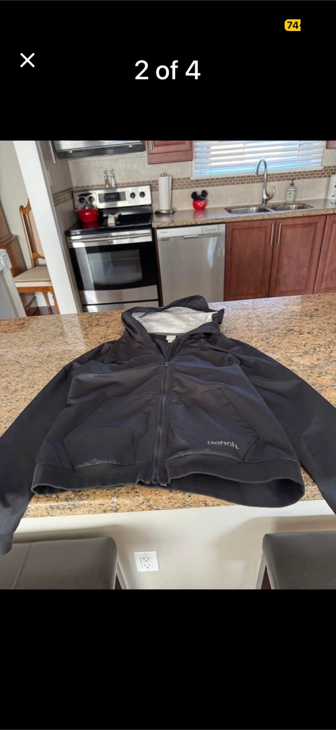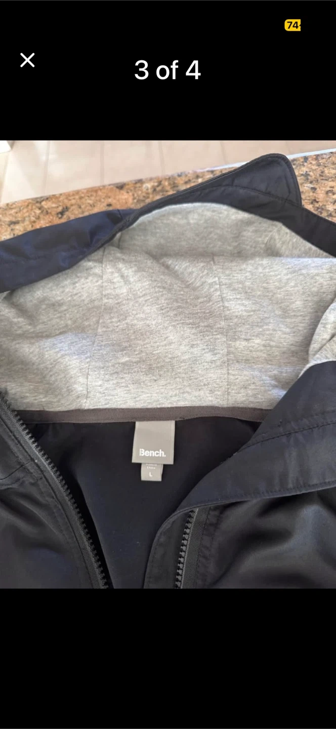 This is a black hooded jacket from Bench. It's a size large. The jacket has a zipper closure and two front pockets. Its lining is grey.