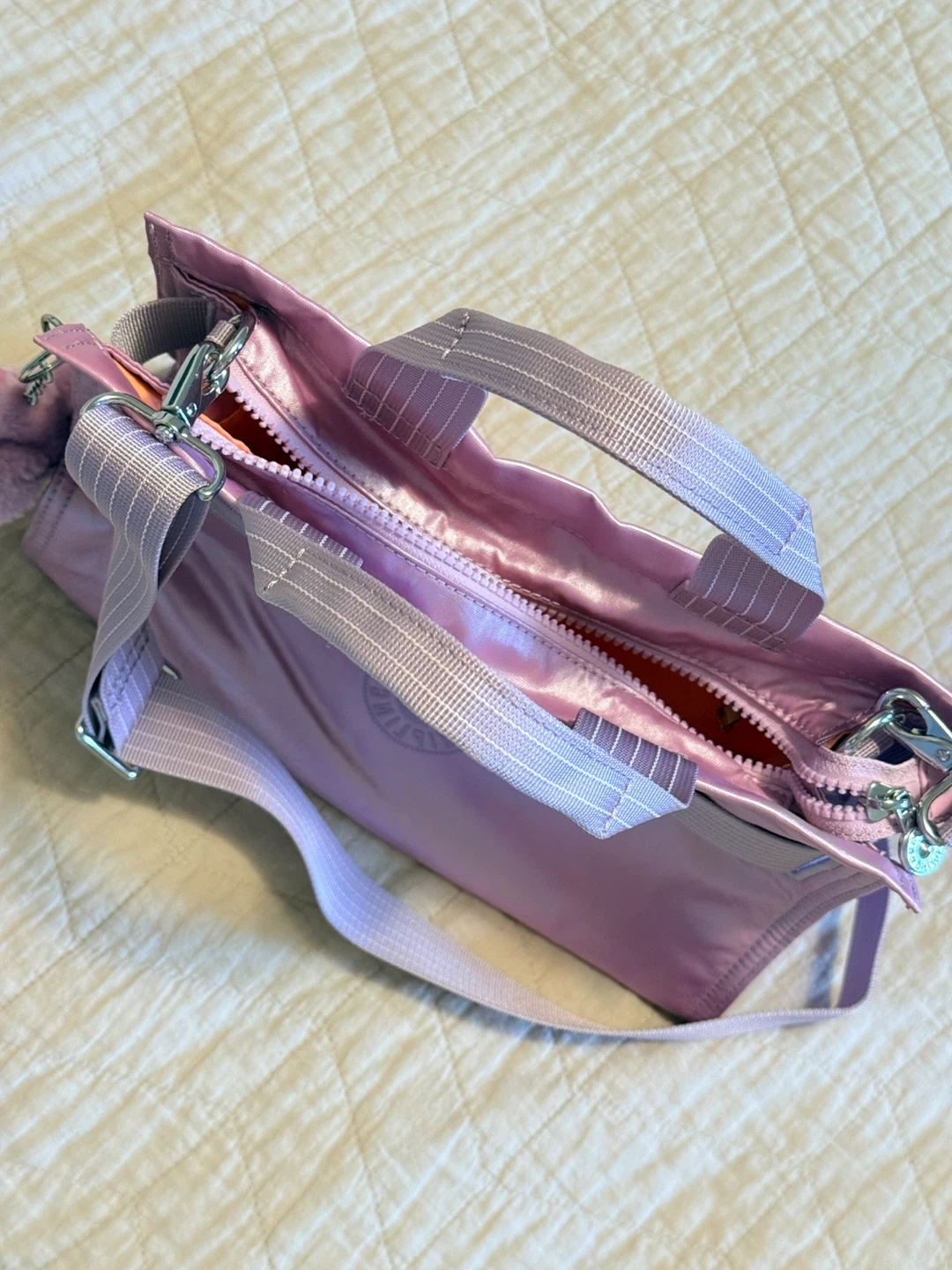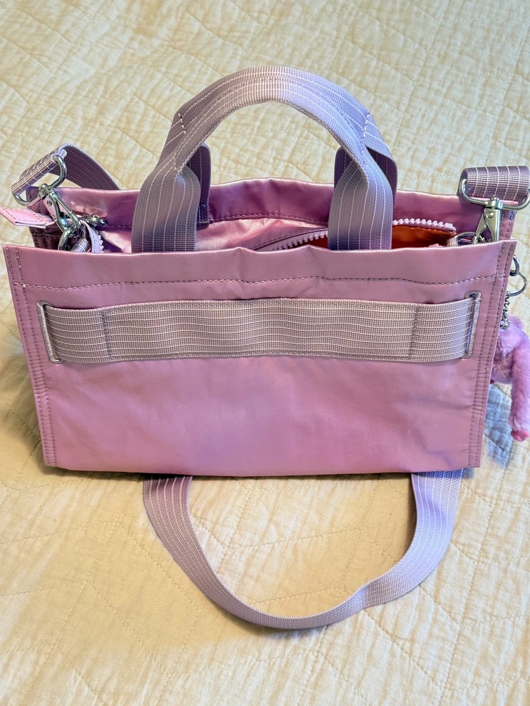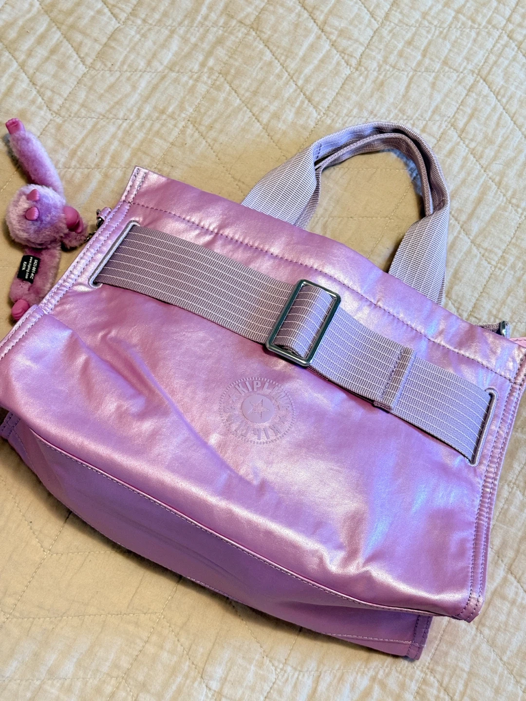 It has a metallic finish and includes a matching monkey charm. The bag features a zippered main compartment and adjustable shoulder straps.
