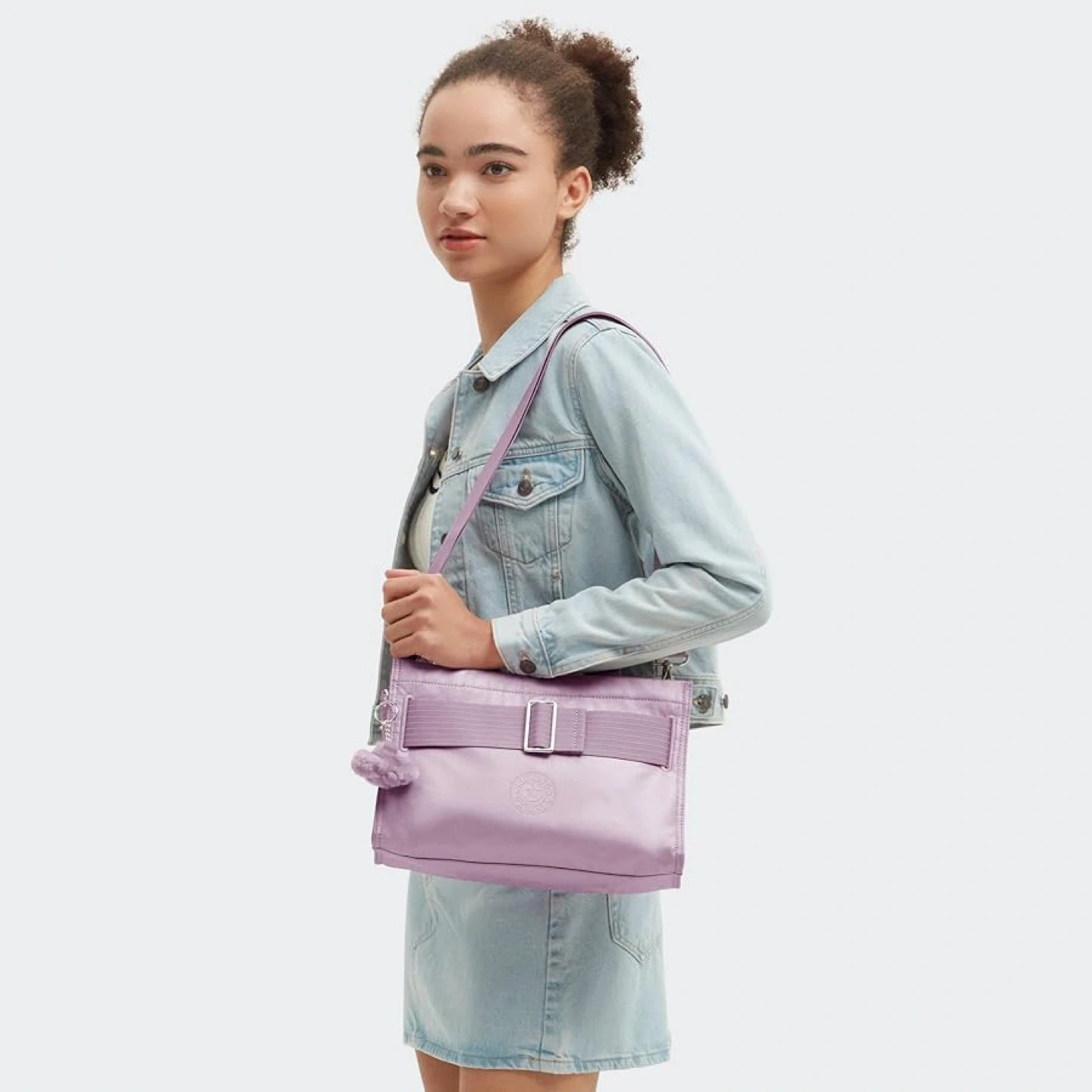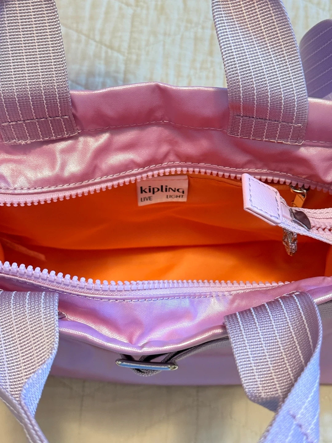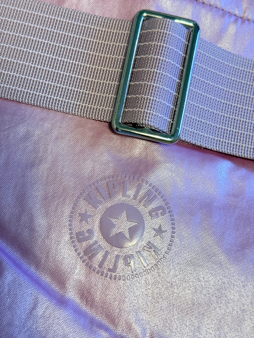 It has a metallic finish and includes a matching monkey charm. The bag features a zippered main compartment and adjustable shoulder straps.