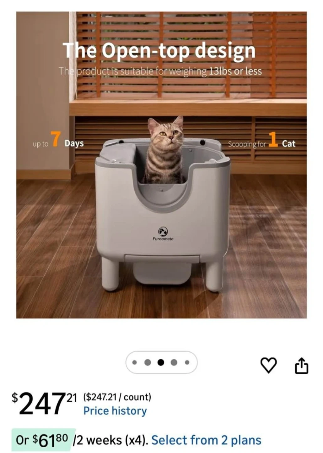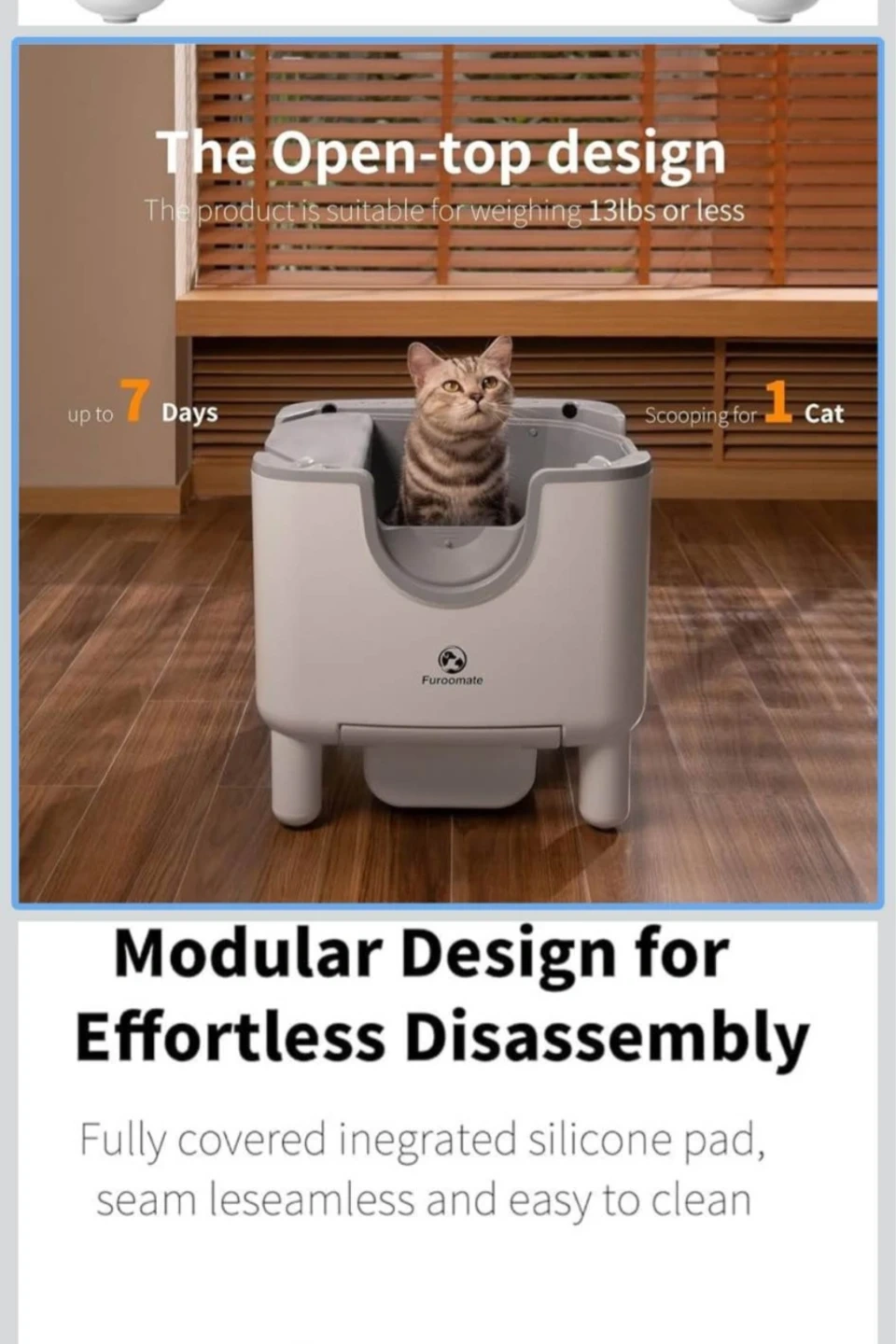 Furoomate AutoScooper 11 self-cleaning cat litter box. The open-top design is suitable for cats weighing 13lbs or less. Scooping for 1 cat. The whole cleaning process takes 10 minutes.