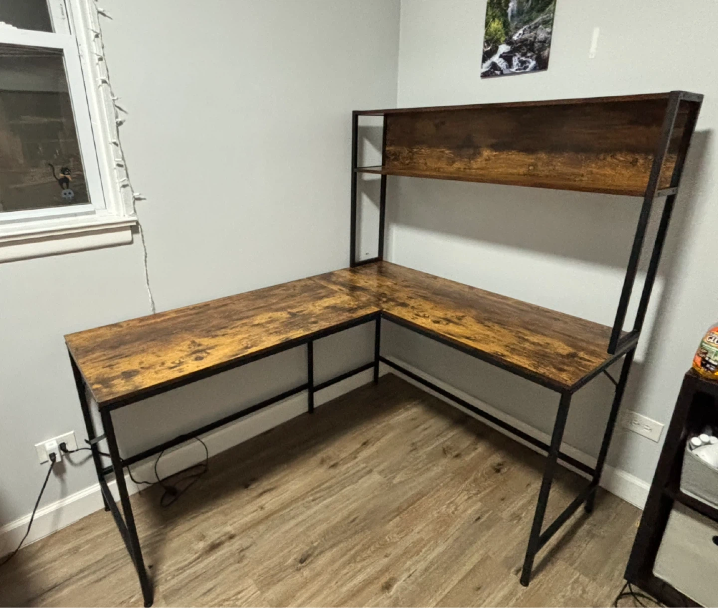 Selling an L-shaped desk with a hutch, perfect for a home office or study space. The desk features a brown wood-grain top with a black metal frame. It's in great condition and ready to use.