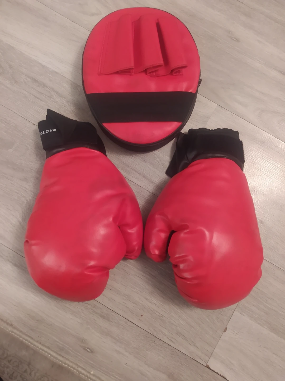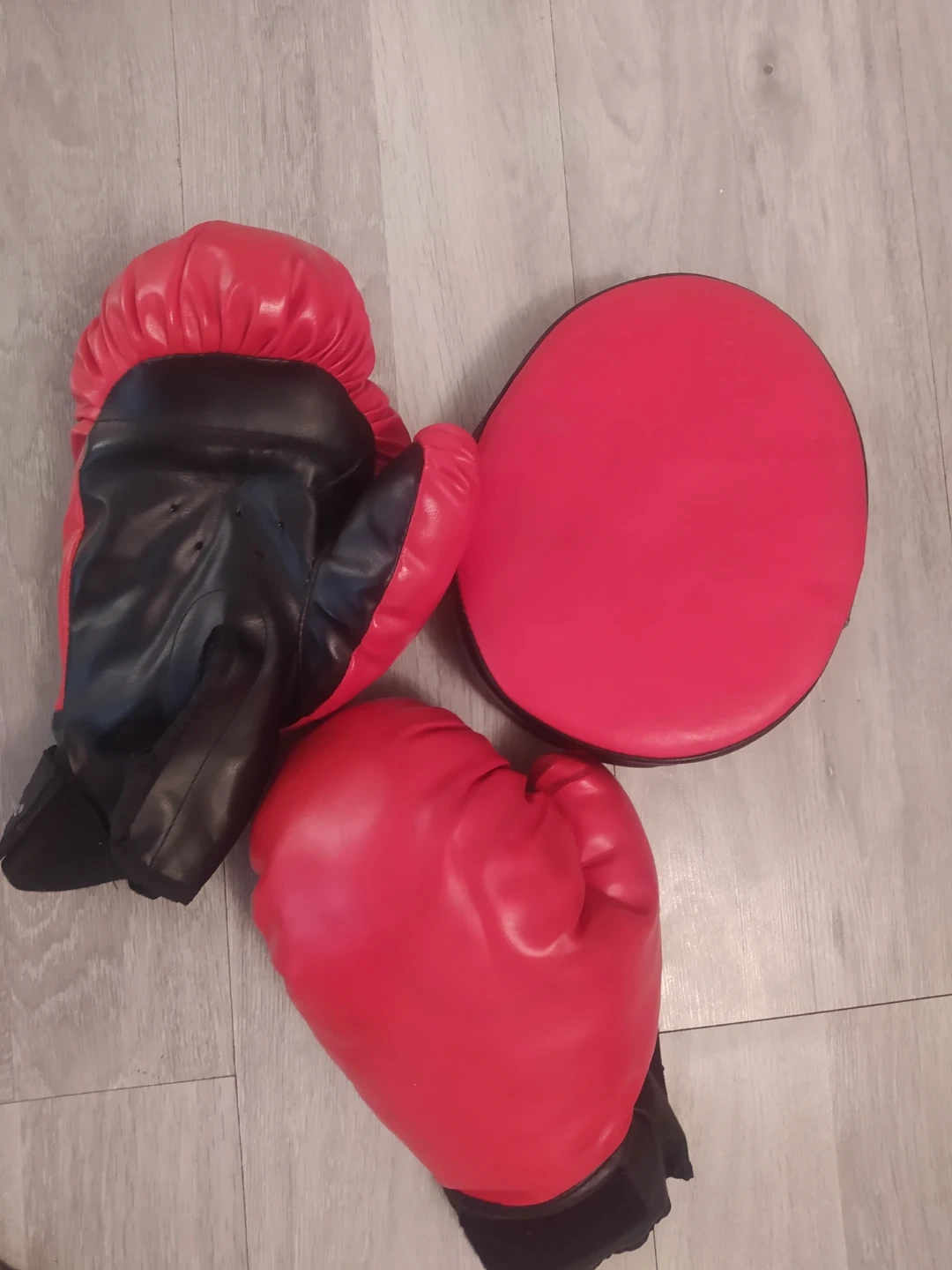 This set includes a pair of red boxing gloves and a red focus mitt. They are made from a synthetic leather material. These are perfect for training sessions!