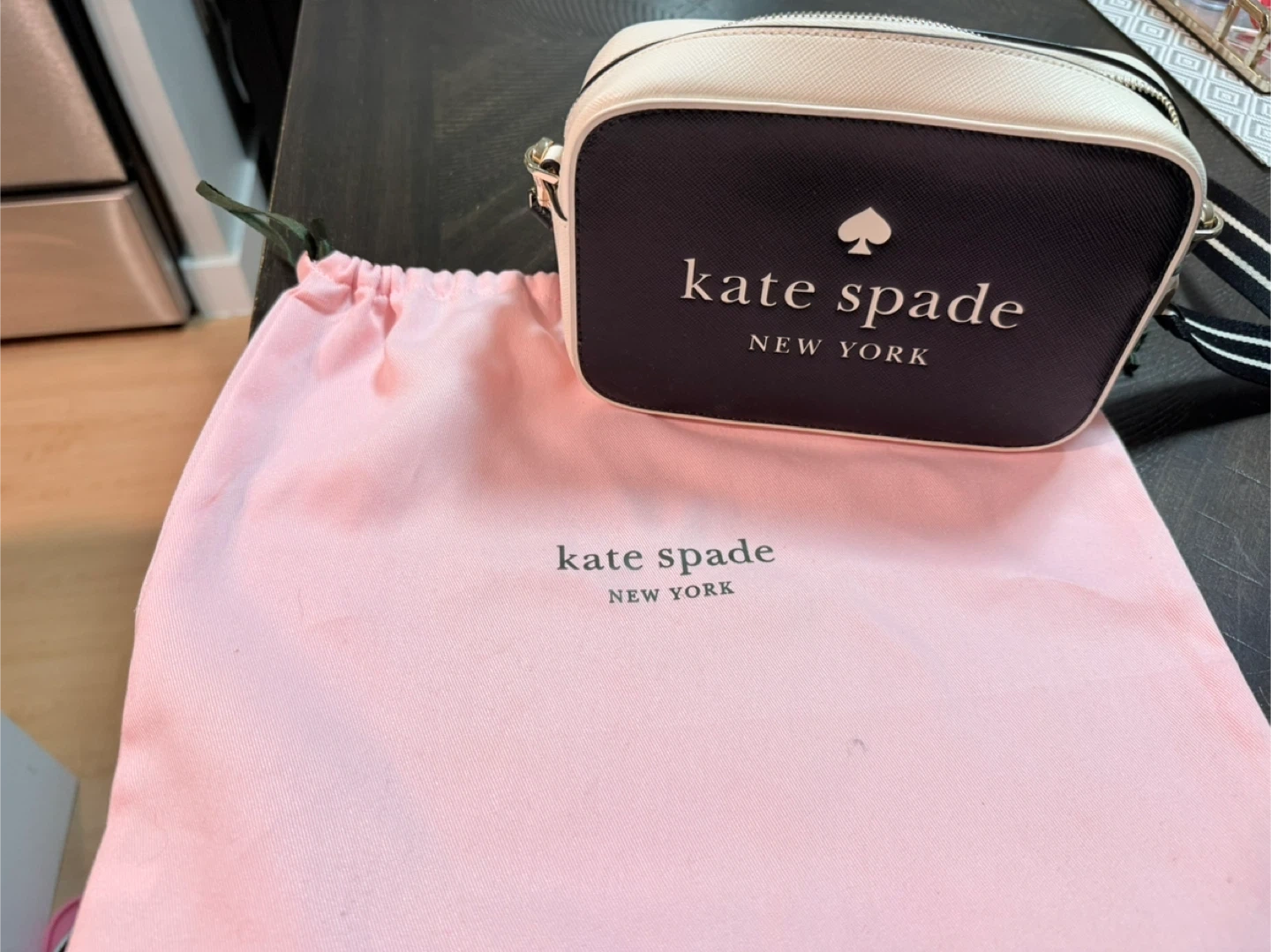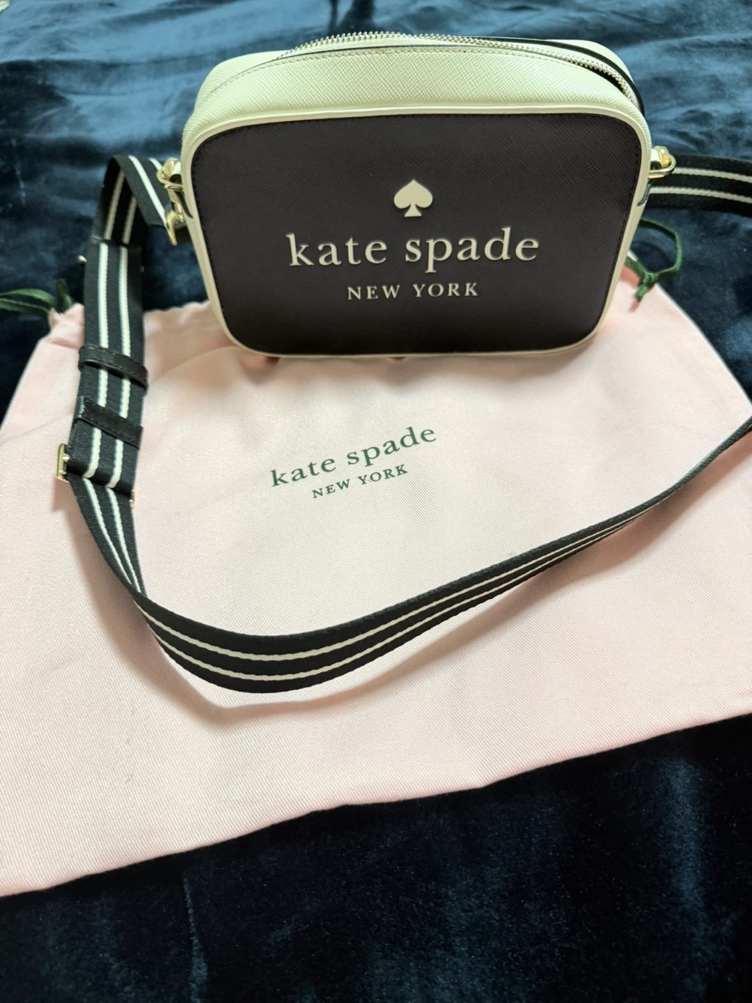 Kate Spade New York camera bag. Features a black and cream colourway with the signature spade logo. Includes original dust bag.