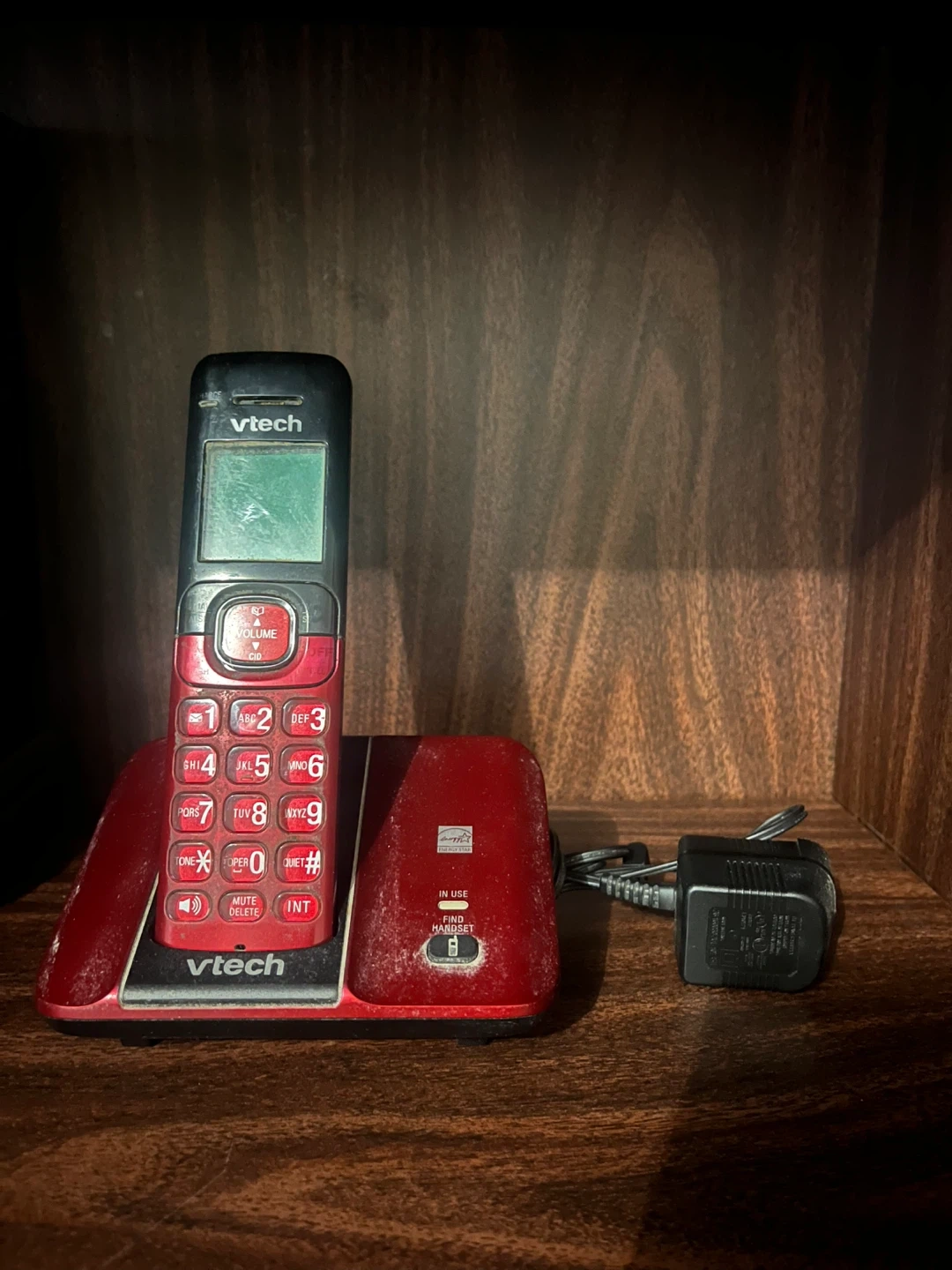 Red VTech cordless phone with a charging base and power adapter included. It has a digital display and a full keypad for dialing. Includes a find handset button on the base.