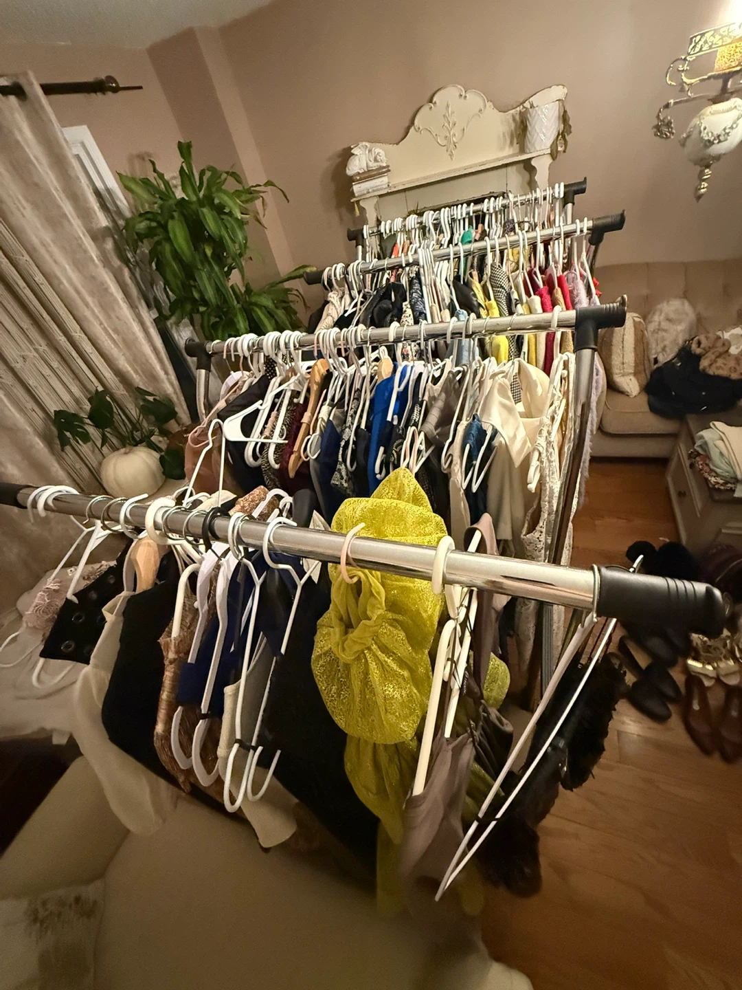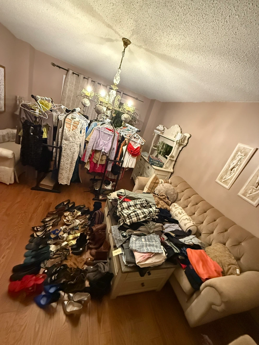 A collection of women's clothing and shoes in various styles and sizes. Includes dresses, tops, pants, skirts, and a wide selection of footwear. Fabrics include cotton, polyester, and blends. Prices range from $5 to $40.