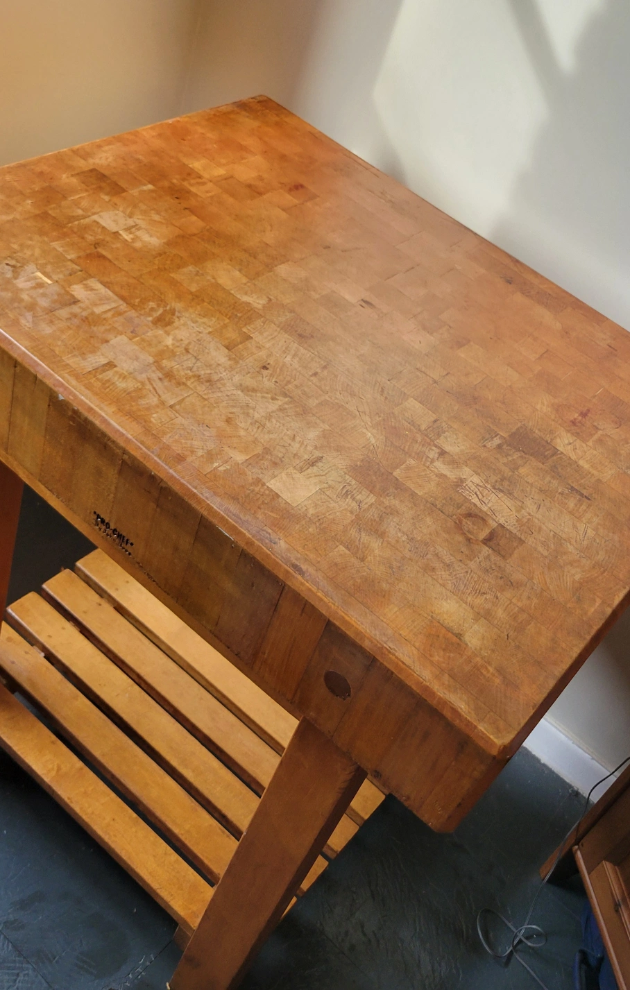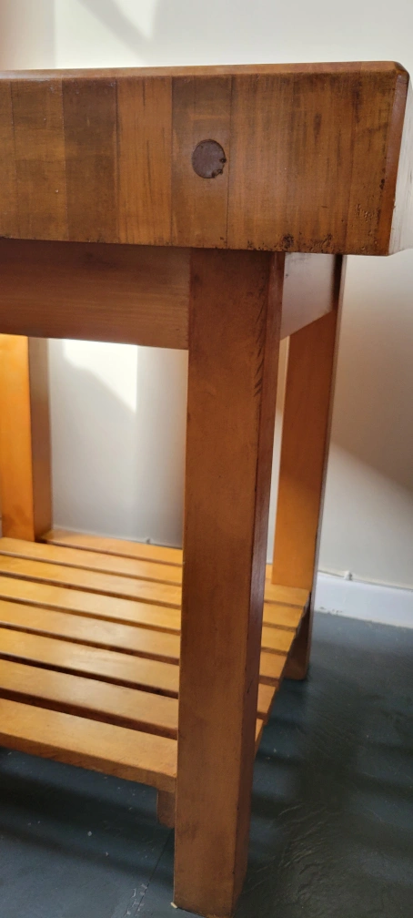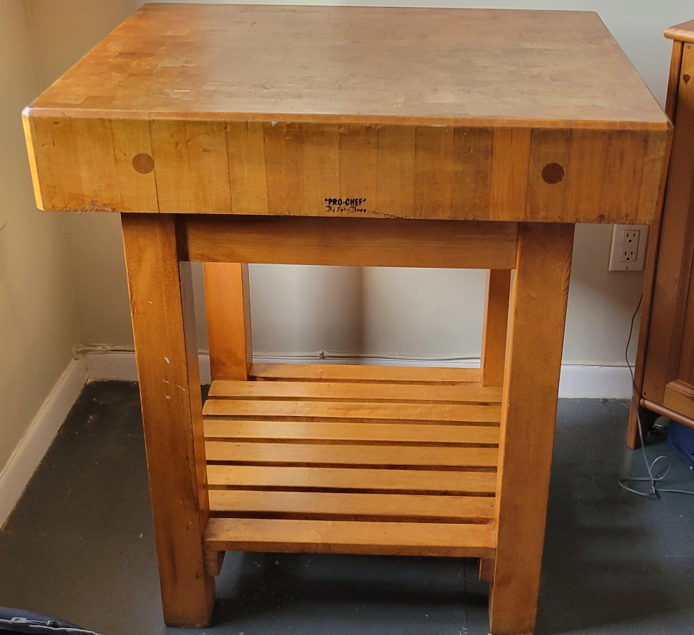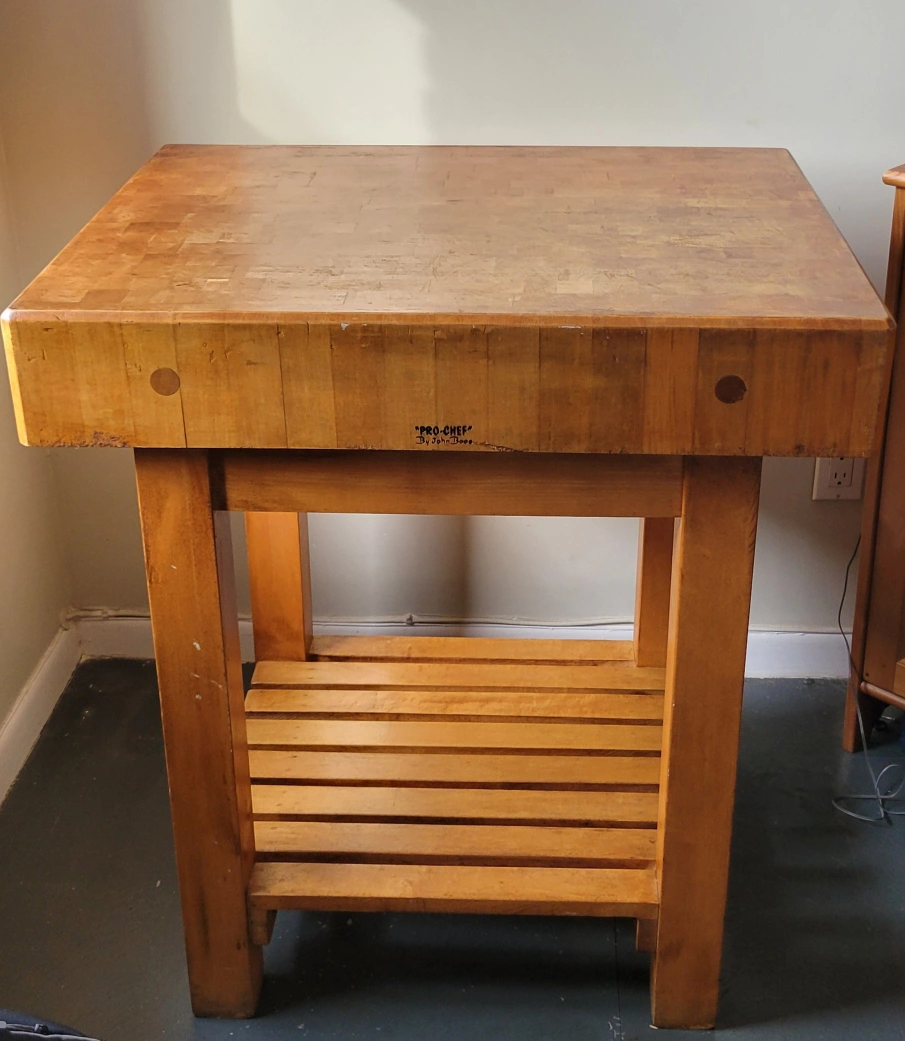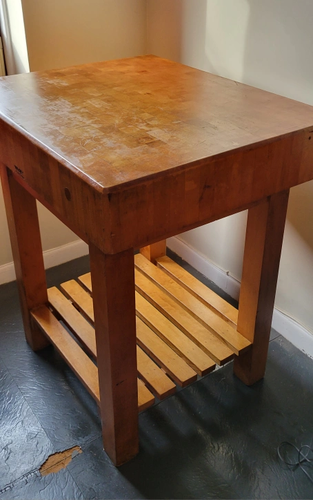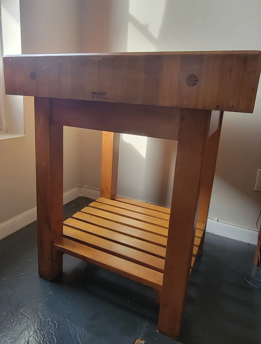 Wooden butcher block kitchen island. Features a large cutting surface and a lower shelf. Solid wood construction. Shows signs of use.