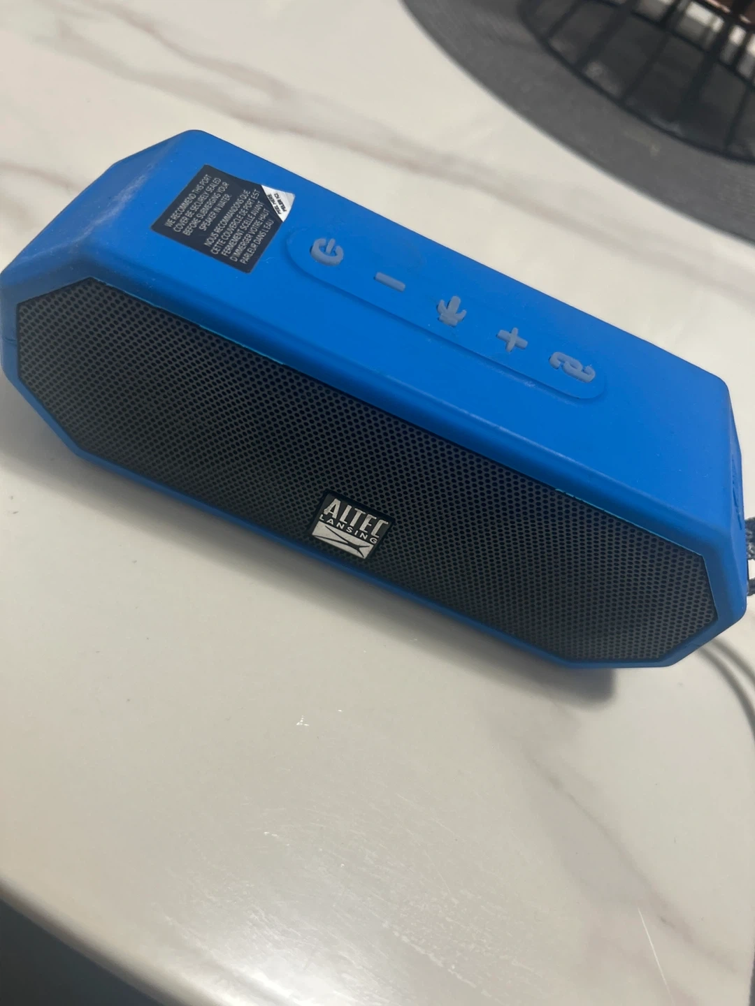 This is a blue Altec Lansing portable Bluetooth speaker. It's designed to be water-resistant. It has buttons for power, volume, and playback.