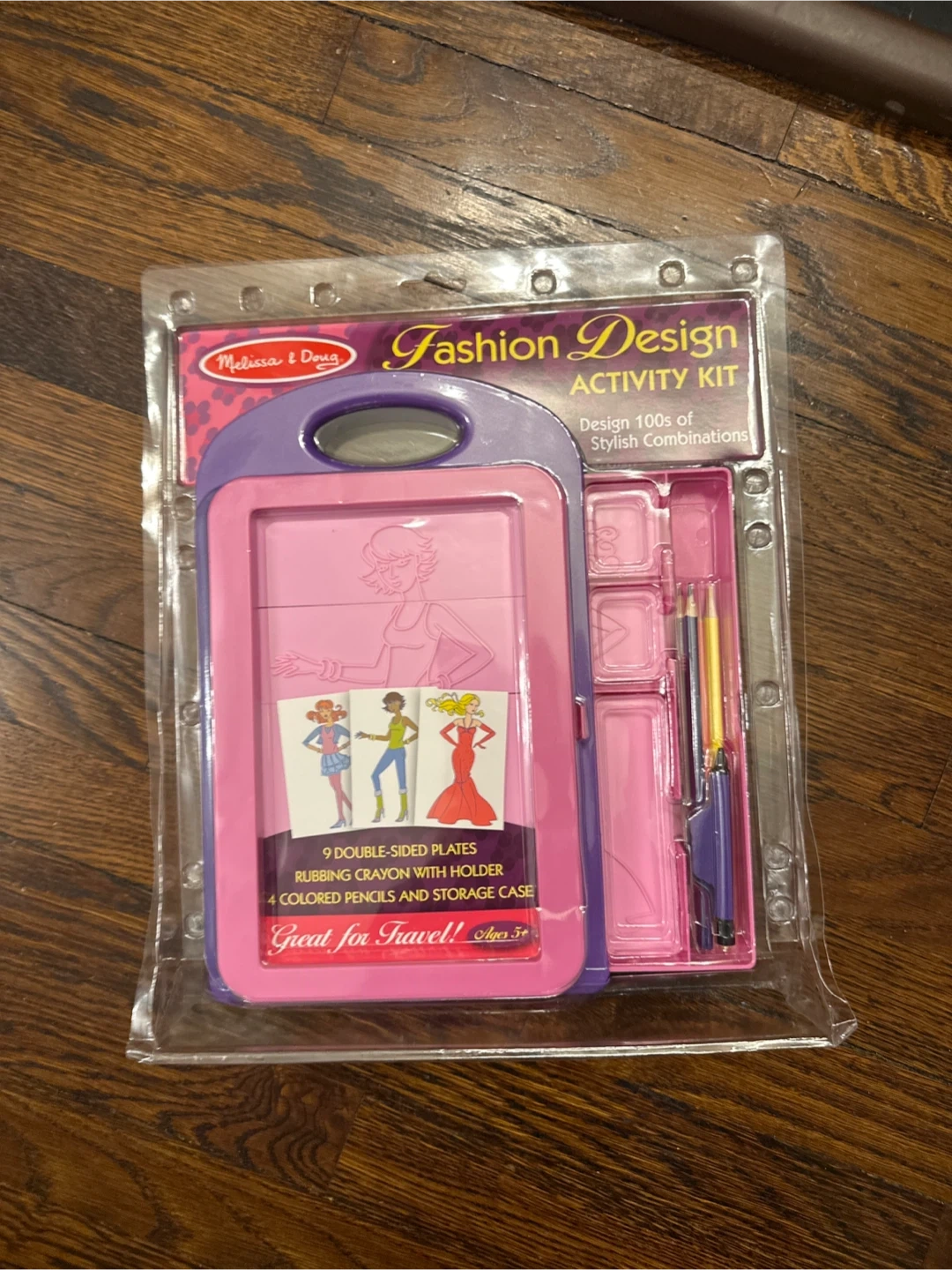 NEW IN BOX This Fashion Design Activity Kit from Melissa & Doug is designed for ages 5 and up. It includes 9 double-sided plates, a rubbing crayon with holder, 4 colored pencils, and a storage case. It's great for travel! fashion plates