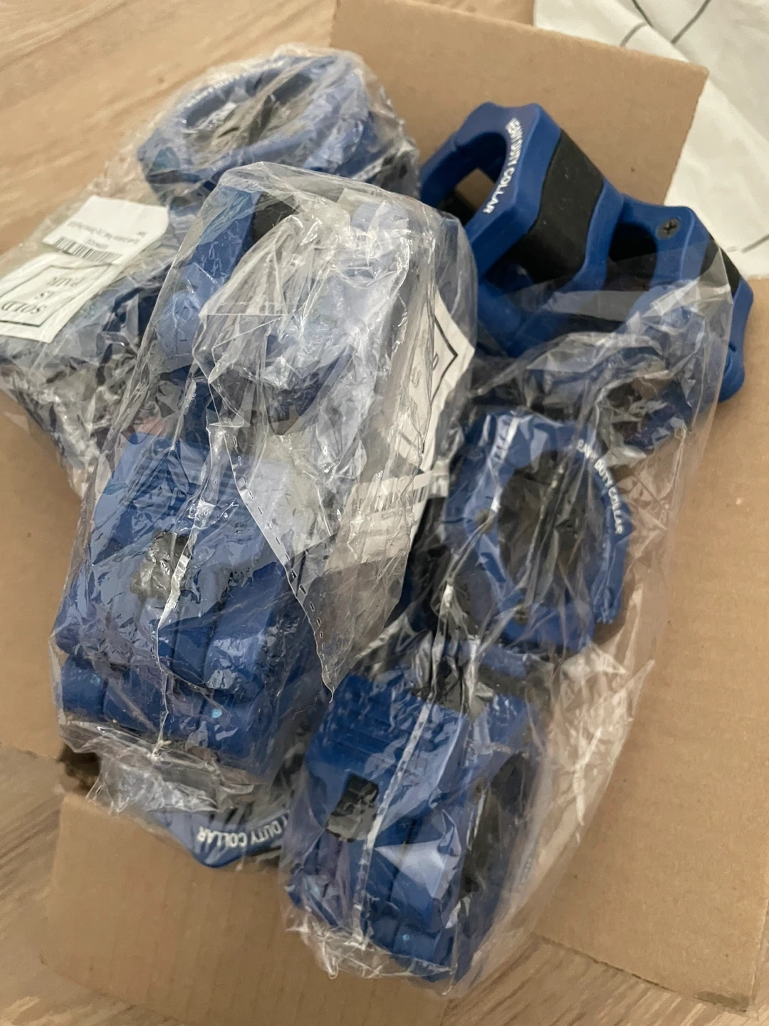 Set of 2 blue heavy duty collars for weightlifting. Clamps securely to barbells. Durable construction. I have about 5 sets available at $15/each