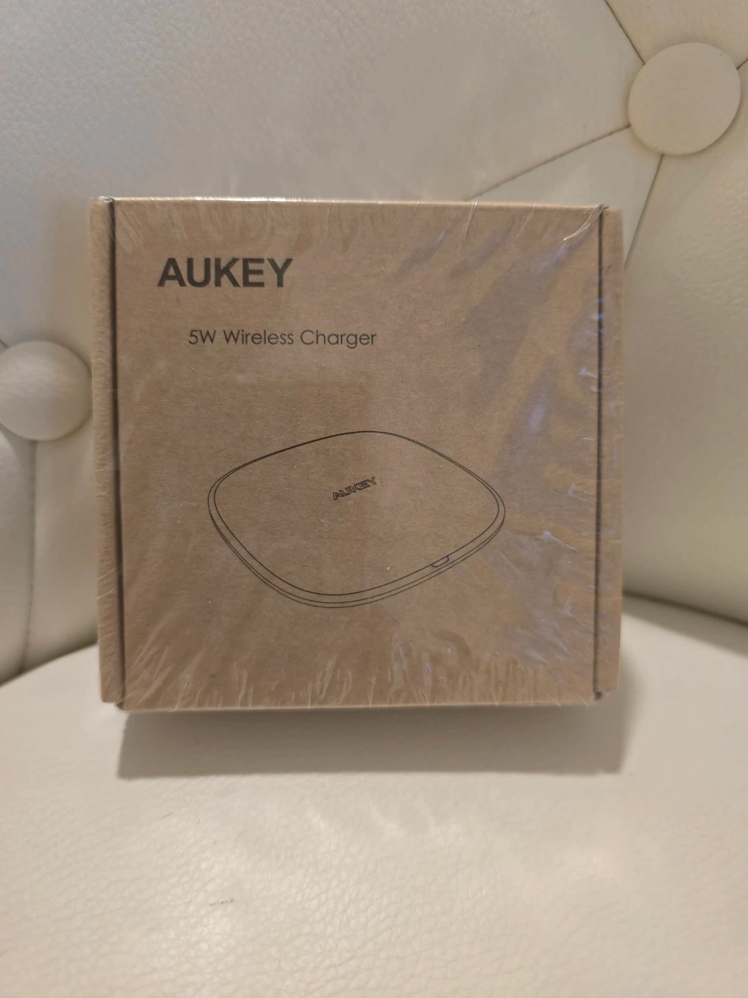 This is an AUKEY 5W wireless charger. It's black and comes in its original packaging. This charger uses a USB connection.