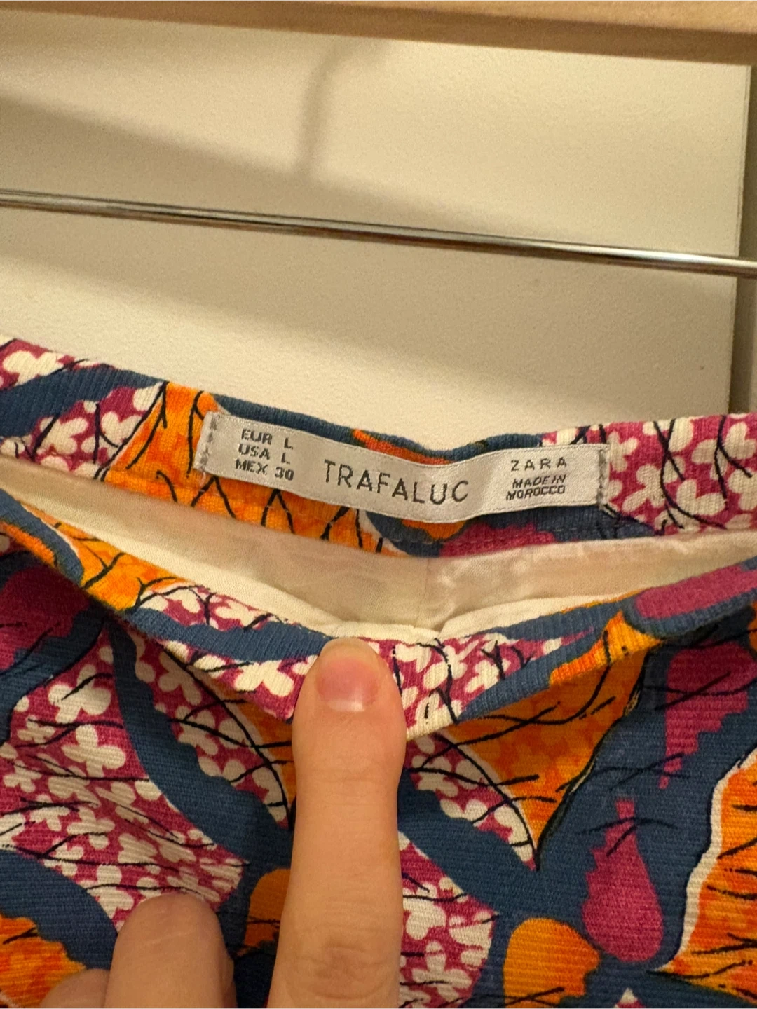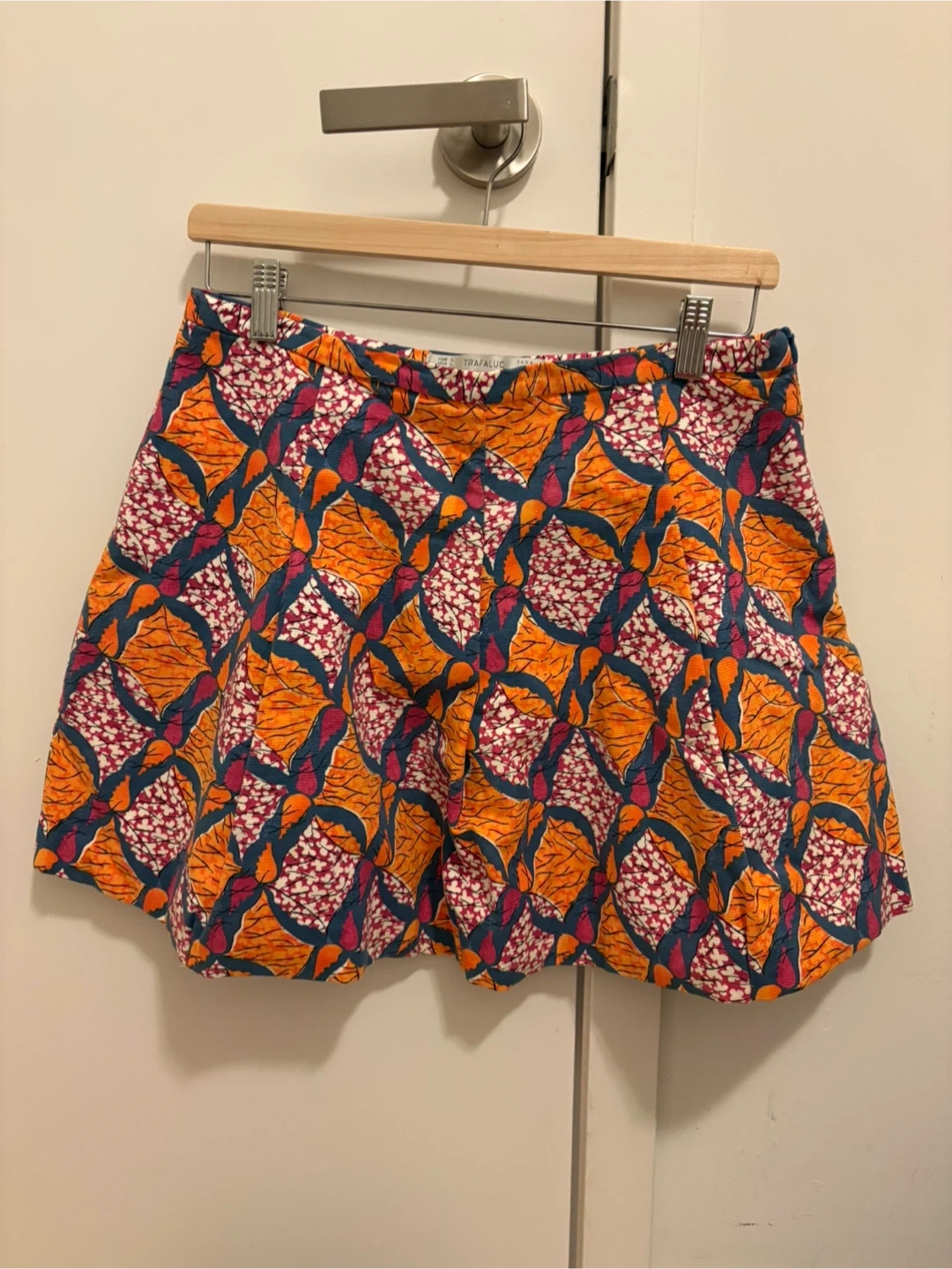 This is a Zara Trafaluc skirt in size L. It has a colourful pattern. The material appears to be lightweight and comfortable, perfect for warmer weather. It's in great condition and ready for a new owner!