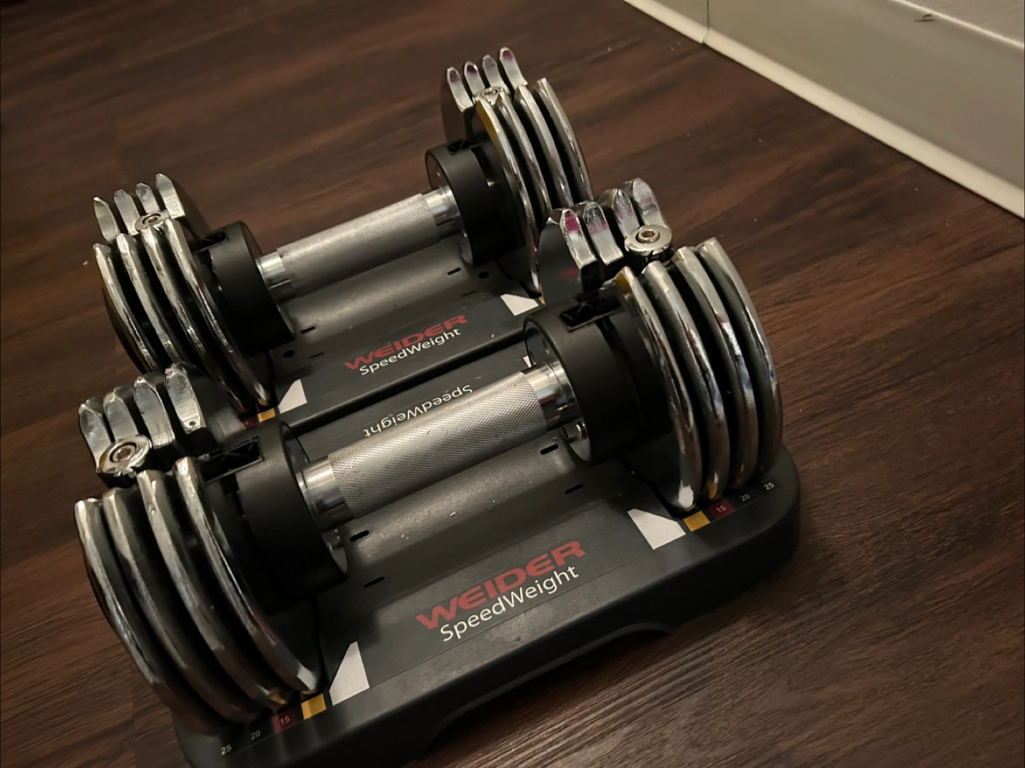 Selling a pair of Weider SpeedWeight adjustable dumbbells! These are in great condition and ready for your home workouts. They're perfect for anyone looking to save space while still having a variety of weight options. Get ready to level up your fitness game!