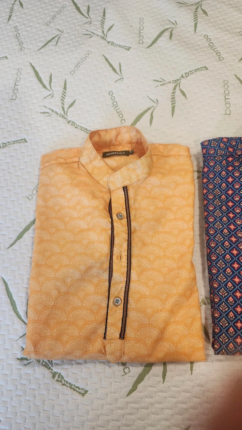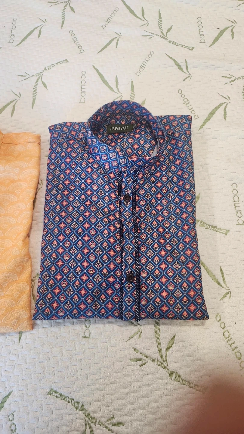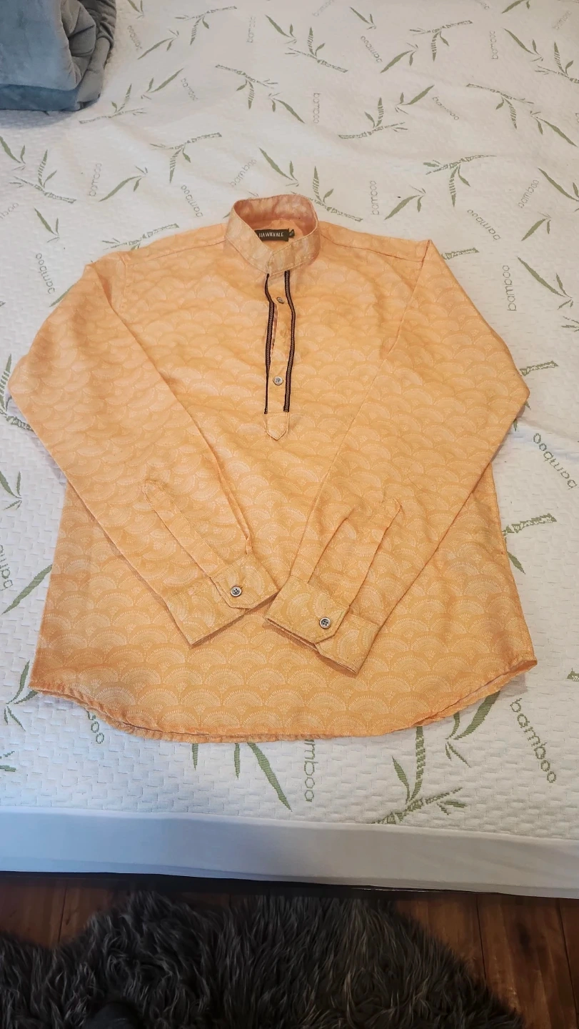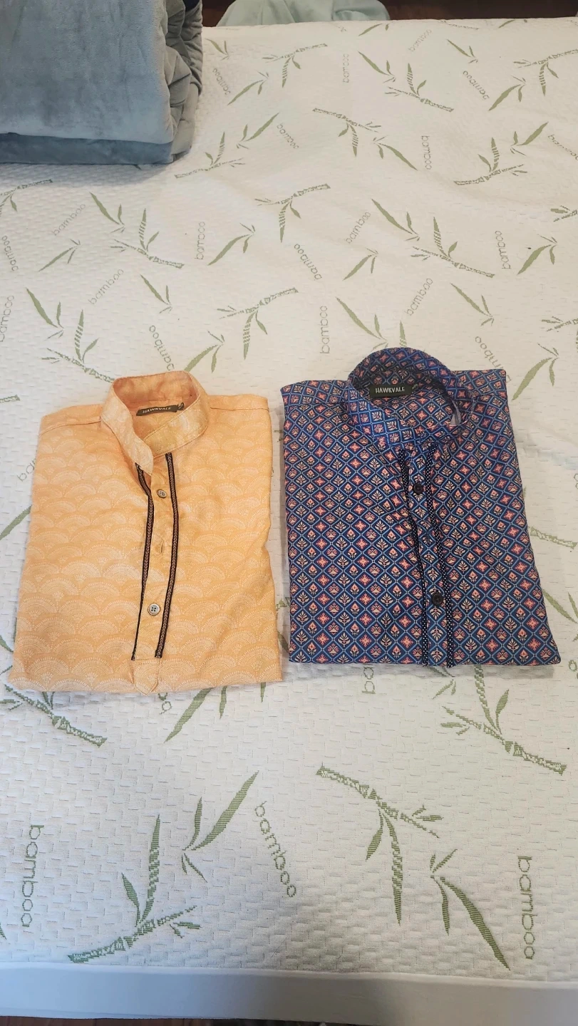 Two stylish Hawkvale boy's kurta shirts. One orange with a subtle pattern and one blue with a vibrant geometric print. Both have button-up necklines and long sleeves. These shirts are great for casual or festive occasions. Will go well with jeans , pants or any other lower. Only worn once each. $10 for both.