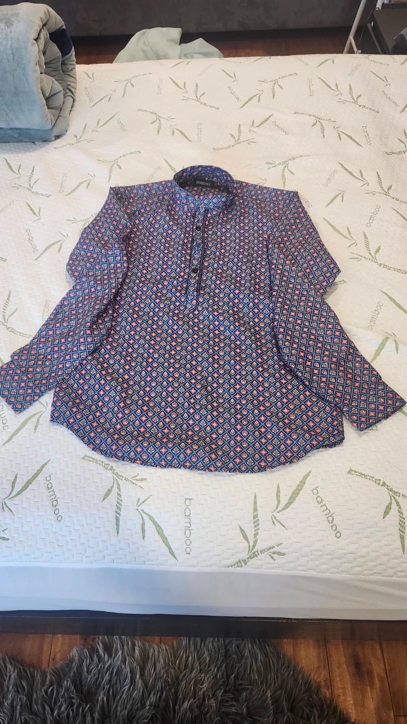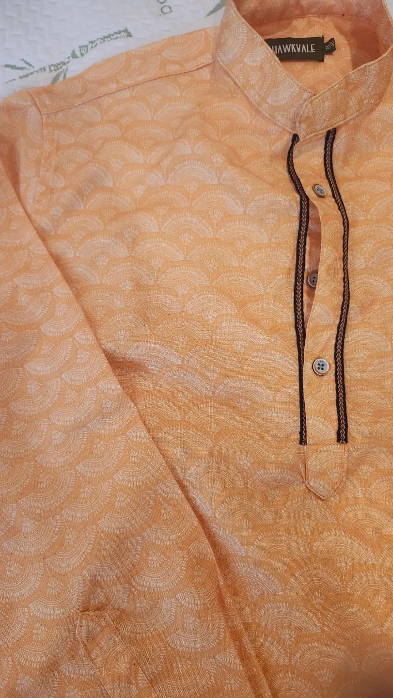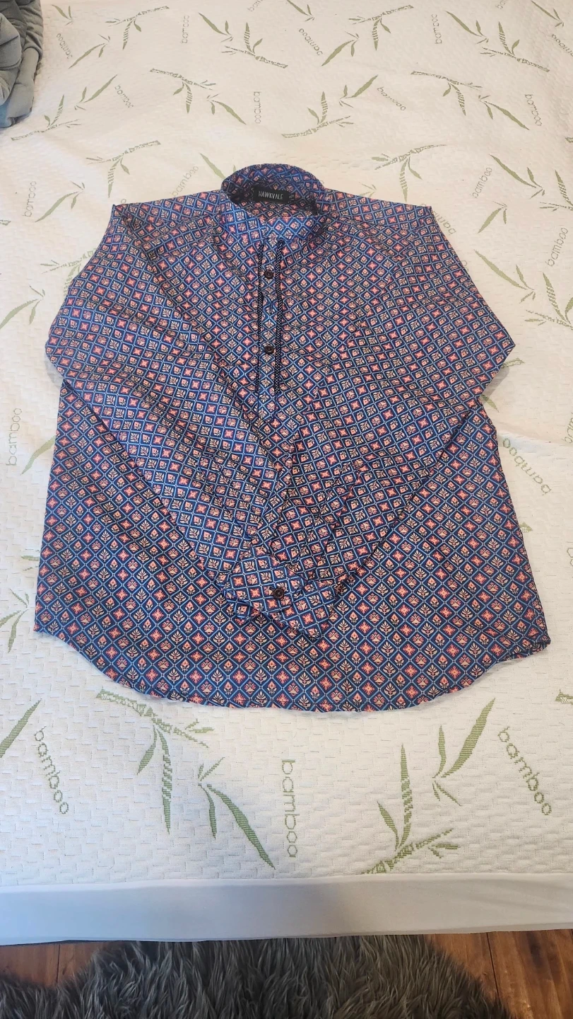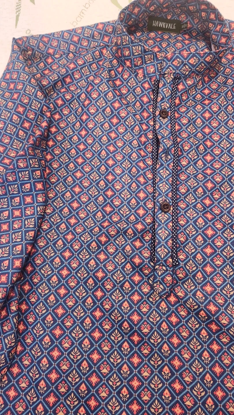 Two stylish Hawkvale boy's kurta shirts. One orange with a subtle pattern and one blue with a vibrant geometric print. Both have button-up necklines and long sleeves. These shirts are great for casual or festive occasions. Will go well with jeans , pants or any other lower. Only worn once each. $10 for both.