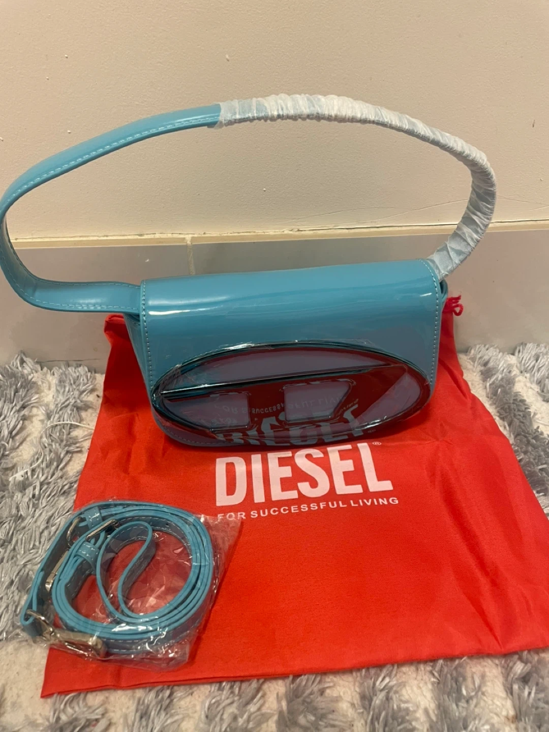 This is a stylish blue patent leather shoulder bag from Diesel. It comes with a dust bag and an adjustable strap for versatility. The glossy finish and iconic Diesel logo make it a statement piece. It's perfect for adding a pop of colour to any outfit! Authentic !