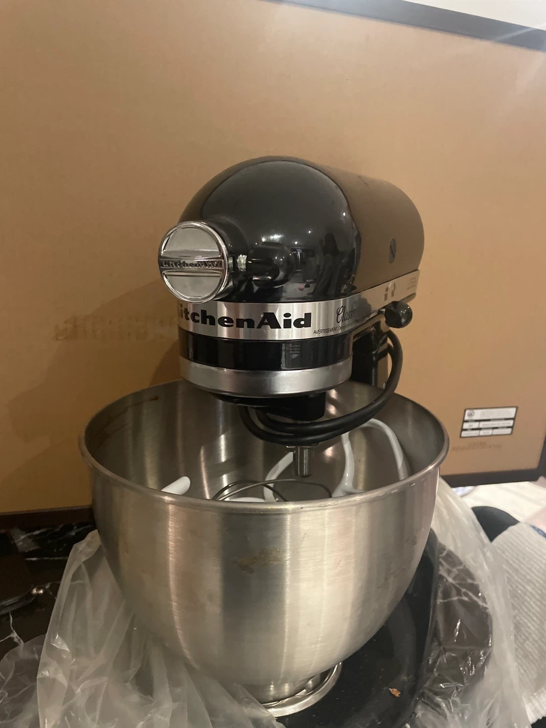 Black KitchenAid Artisan Classic stand mixer with a stainless steel bowl. Includes beater, dough hook, and whisk attachments. It's a tilt-head model. This mixer is great for all your baking needs!