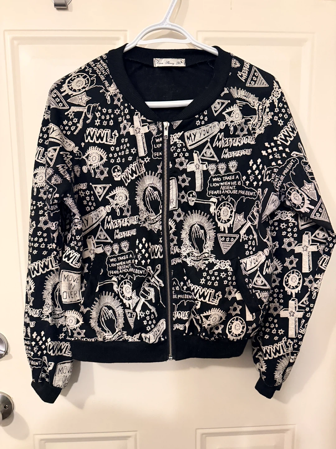 This is a black bomber jacket with a white graphic print.