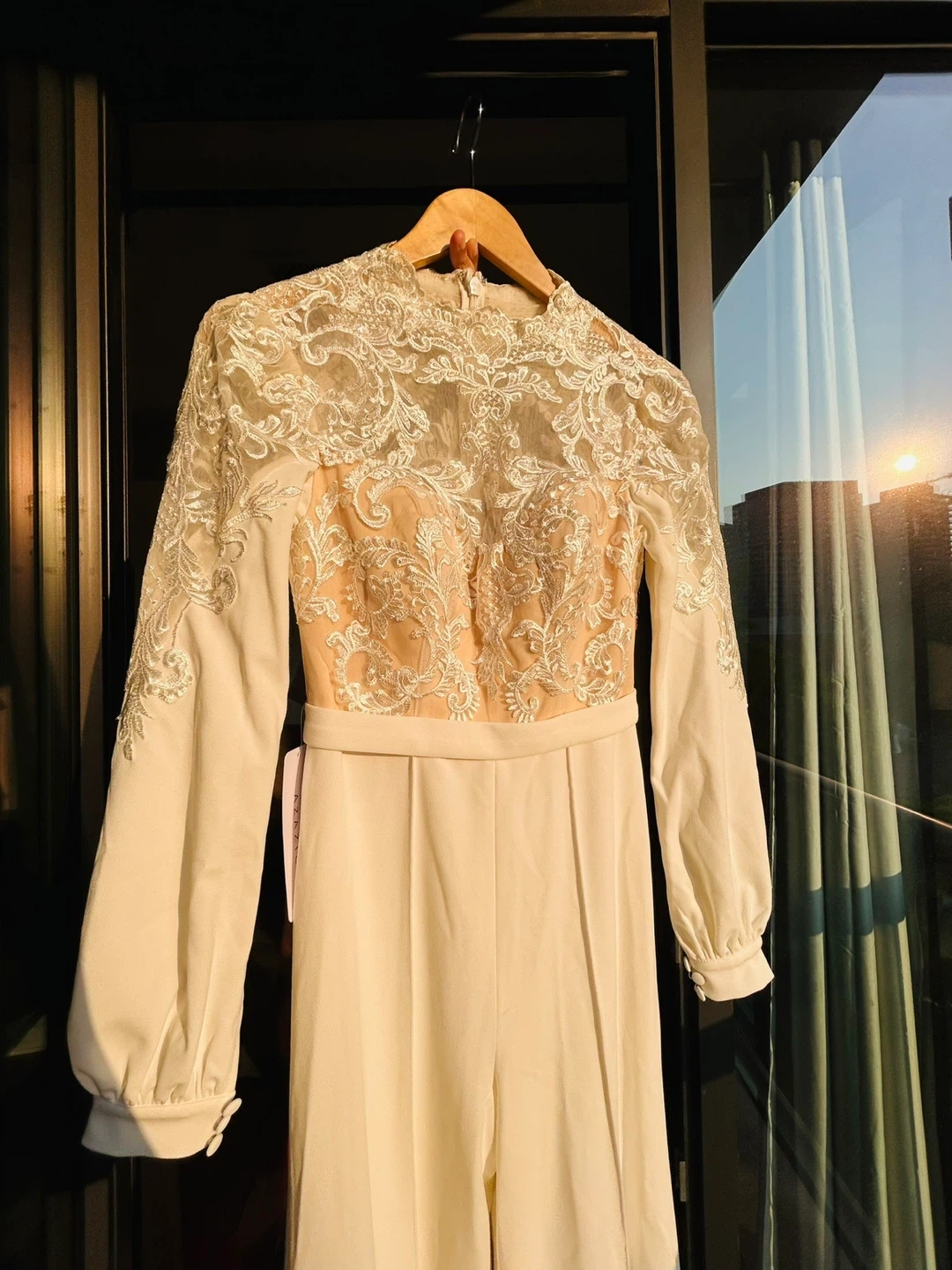 Selling this never-worn, beautiful white lace wedding jumpsuit. The lace detailing is stunning, and the wide-leg pants are super flattering. It was never worn as I got another gown. Still has the tag on it.