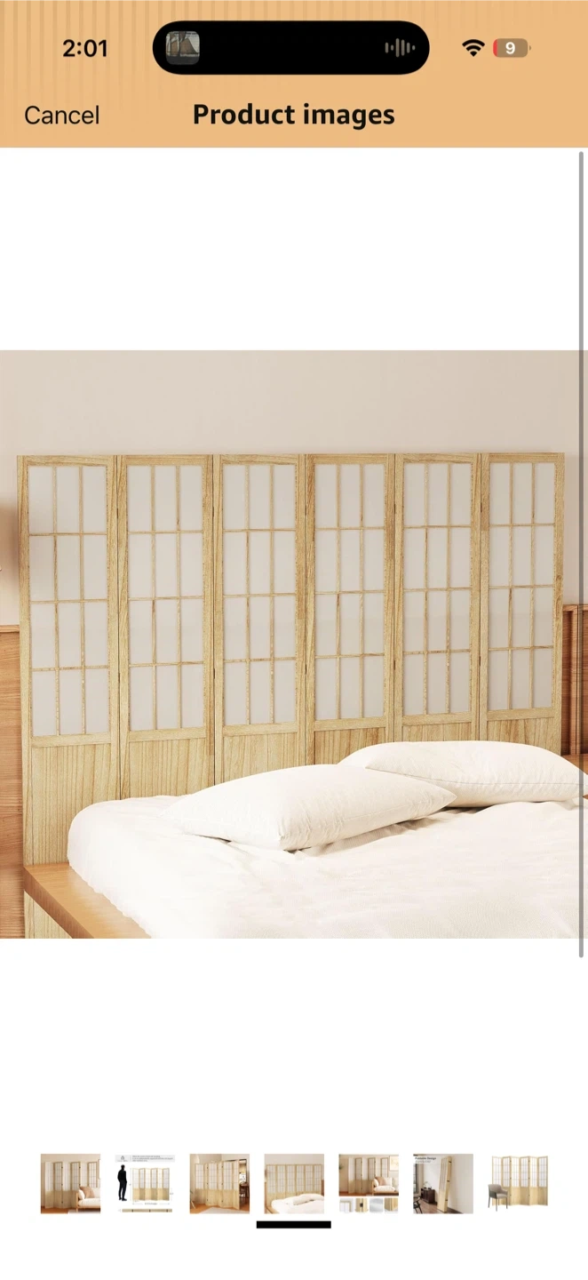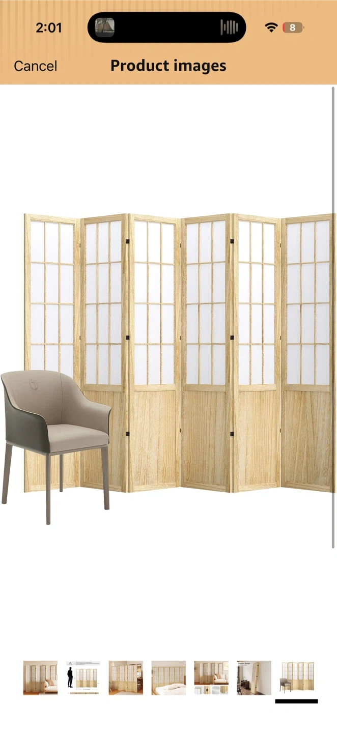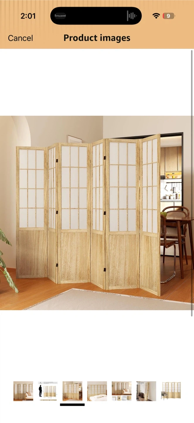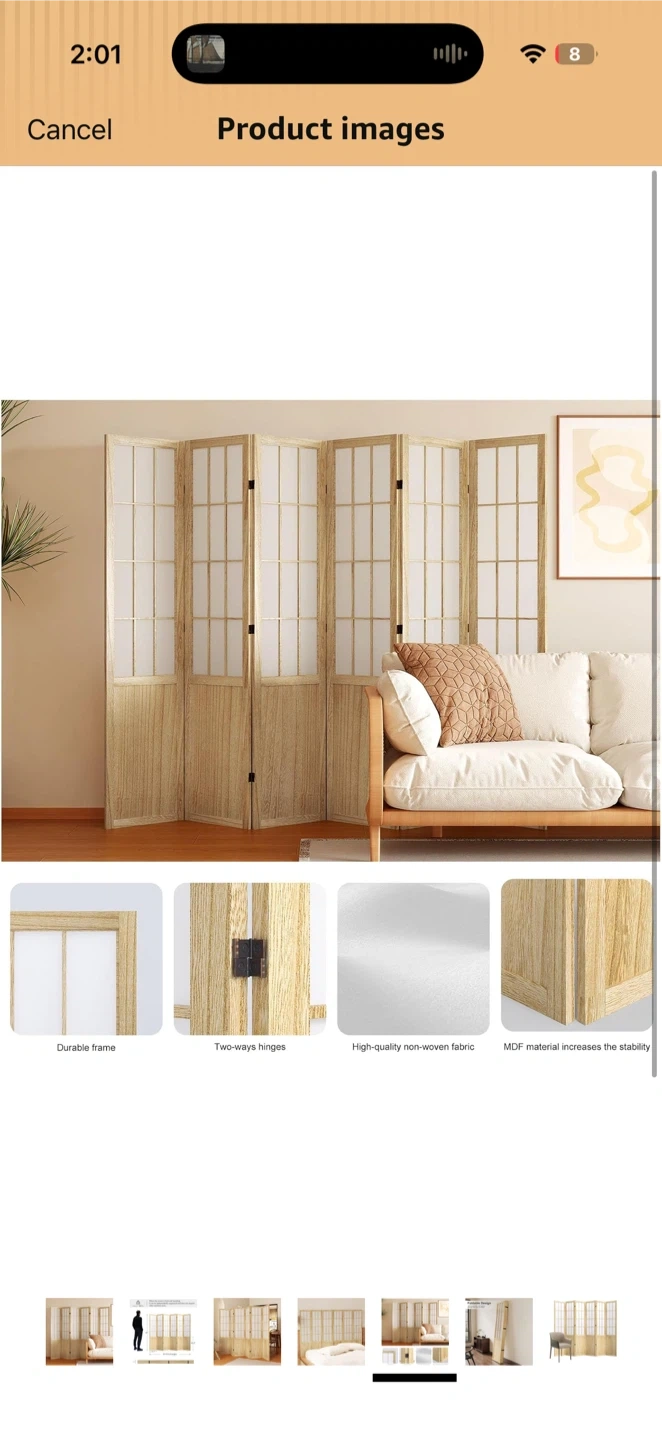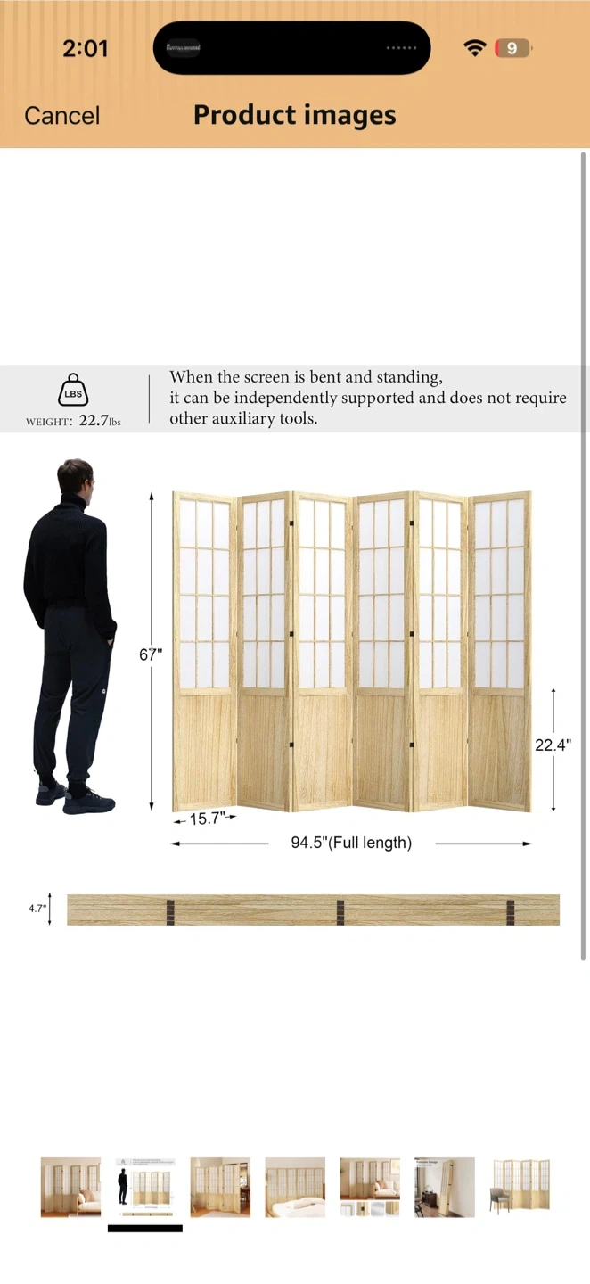 This 6-panel folding room divider screen is 67 inches tall and spans 94.5 inches in full length. It's constructed with a durable MDF frame and high-quality non-woven fabric. The screen stands independently and doesn't require auxiliary tools. This divider is great for creating privacy or separating spaces.