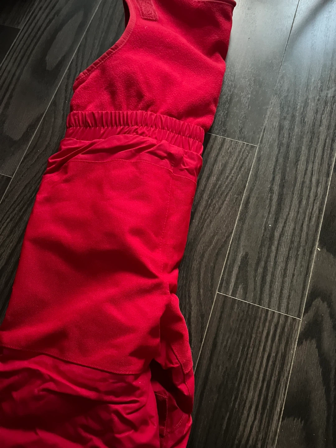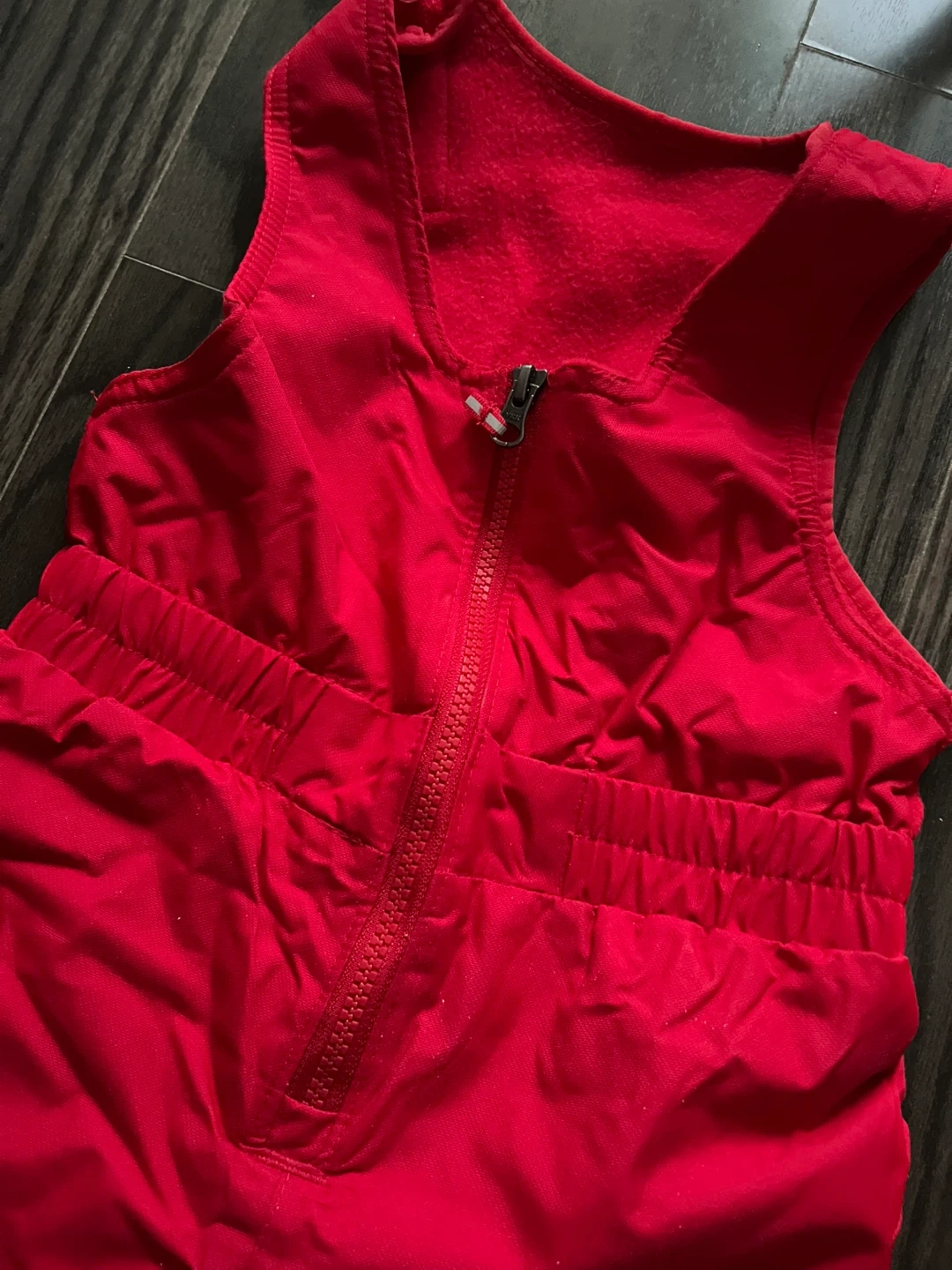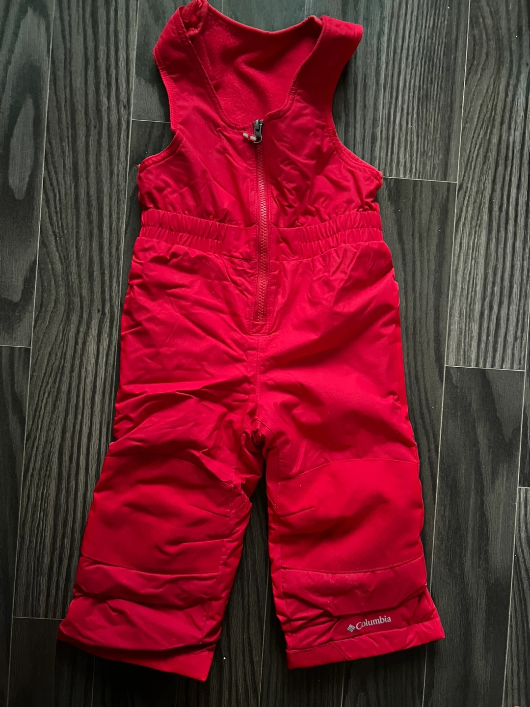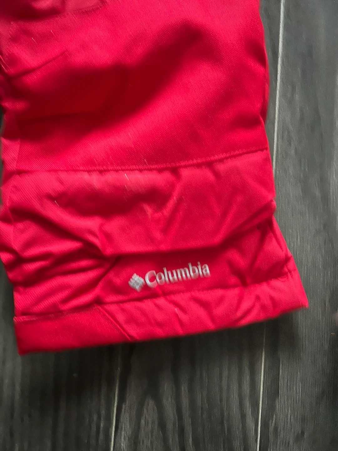 This is a red Columbia ski snowsuit jumpsuit. It's designed for warmth and protection during winter activities. The jumpsuit has a zippered front and elasticized waist for a comfortable fit. It's suitable for cold weather play or hitting the slopes!