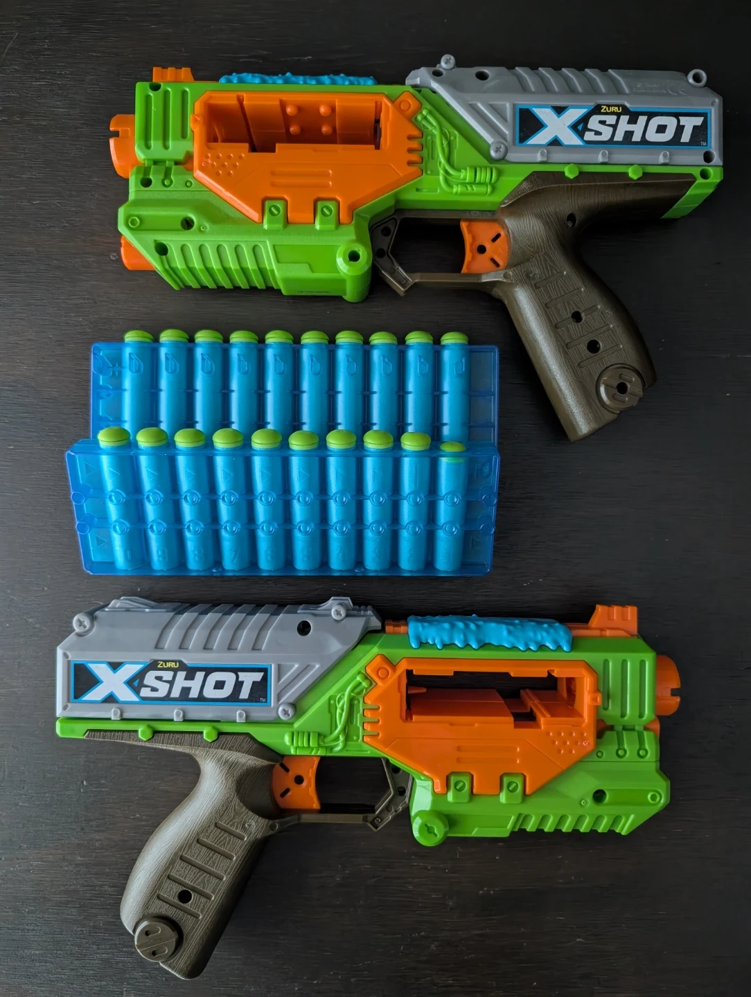 Two Zuru X-Shot blasters, each with a distinct green, orange, and grey design. It also comes with a blue dart clip holding twelve darts. These blasters are ready for some fun! They're great for backyard play.