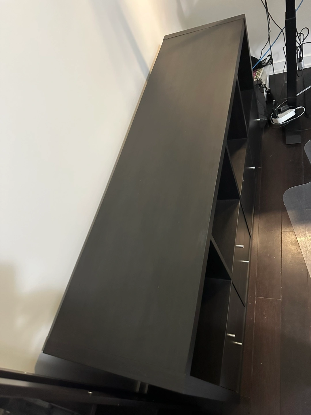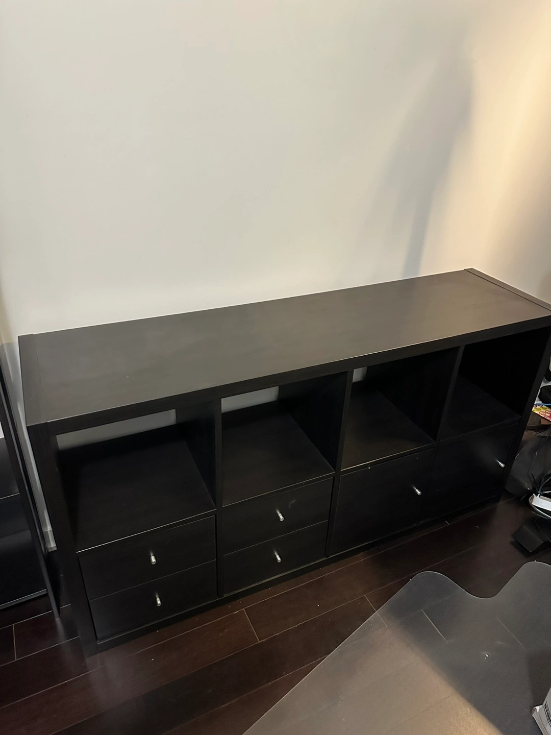 Selling a gently used IKEA KALLAX shelf unit (4x2 configuration) in dark wood finish.