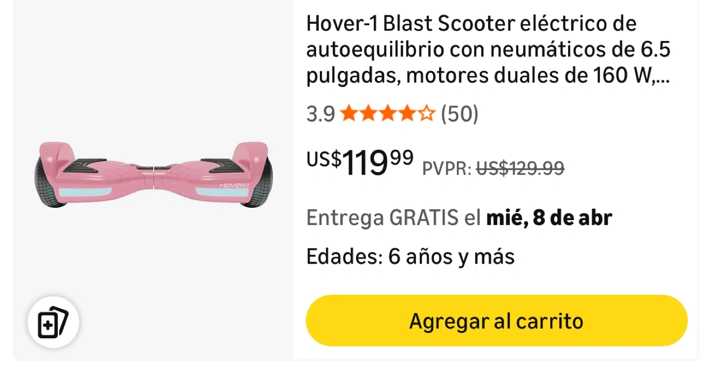 This is a pink Hover-1 Blast hoverboard. It features dual 160W motors and 6.5-inch tires. It's recommended for ages 6 and up.