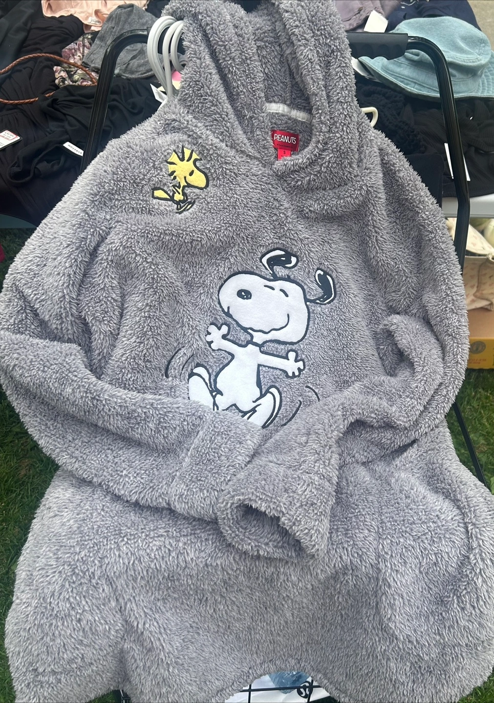 Cozy up with this adorable Peanuts Snoopy hoodie! It's a soft, grey, fuzzy hoodie with Snoopy and Woodstock on it. Has pockets.