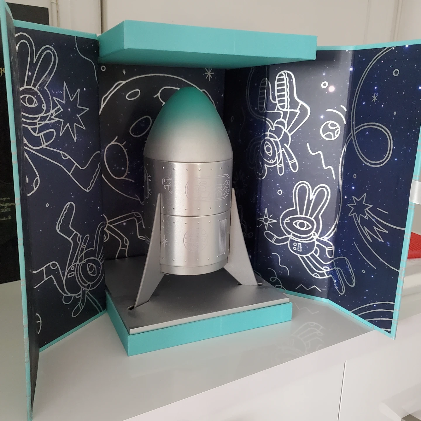 Extremely Rare - Authentic Tiffany & Co. Moon Festival Rocket Tin Can VIP Jewelry Box Limited Edition item. It's a decorative piece with a unique space-themed design. The rocket is silver with a gradient green tip.