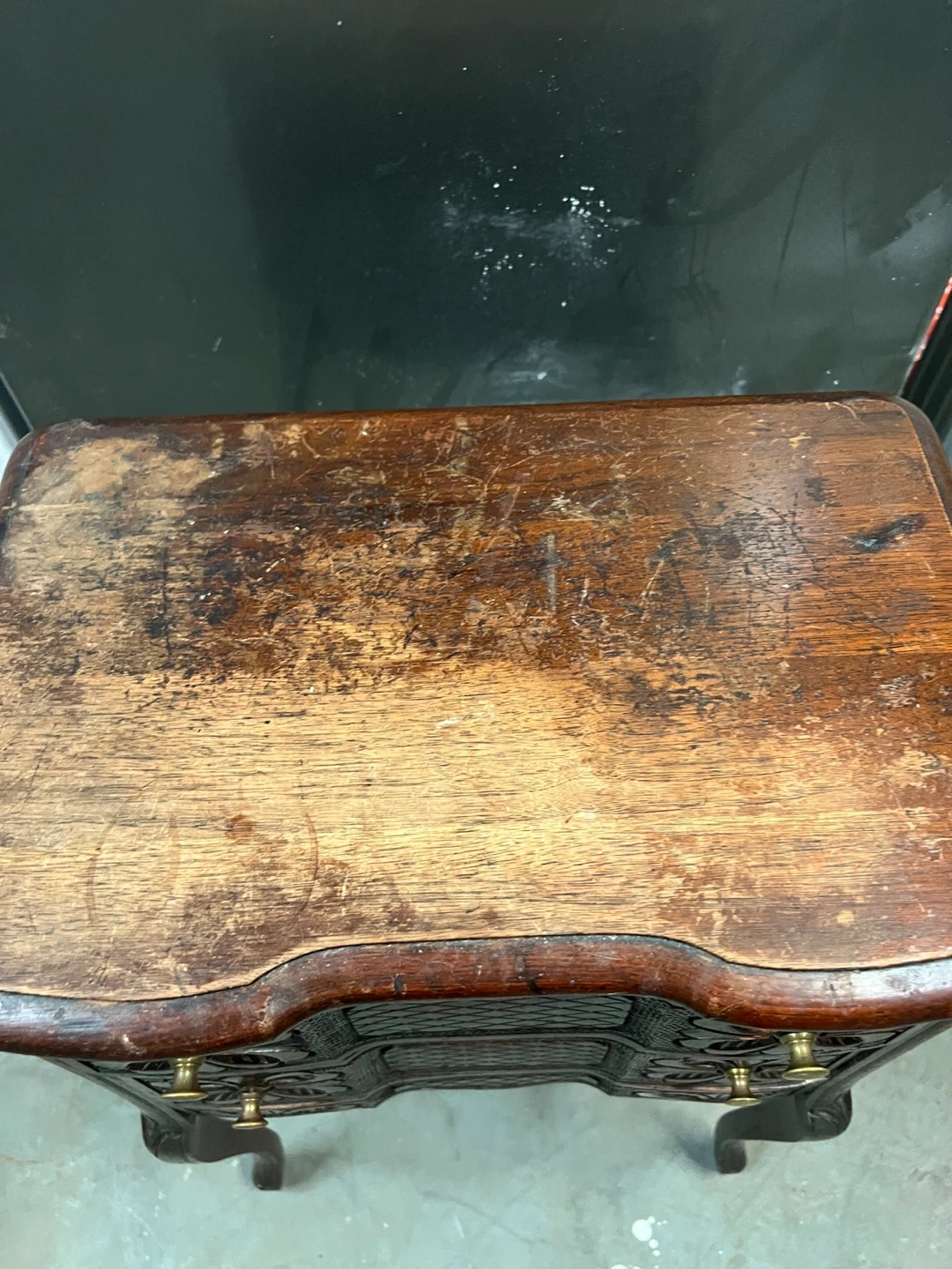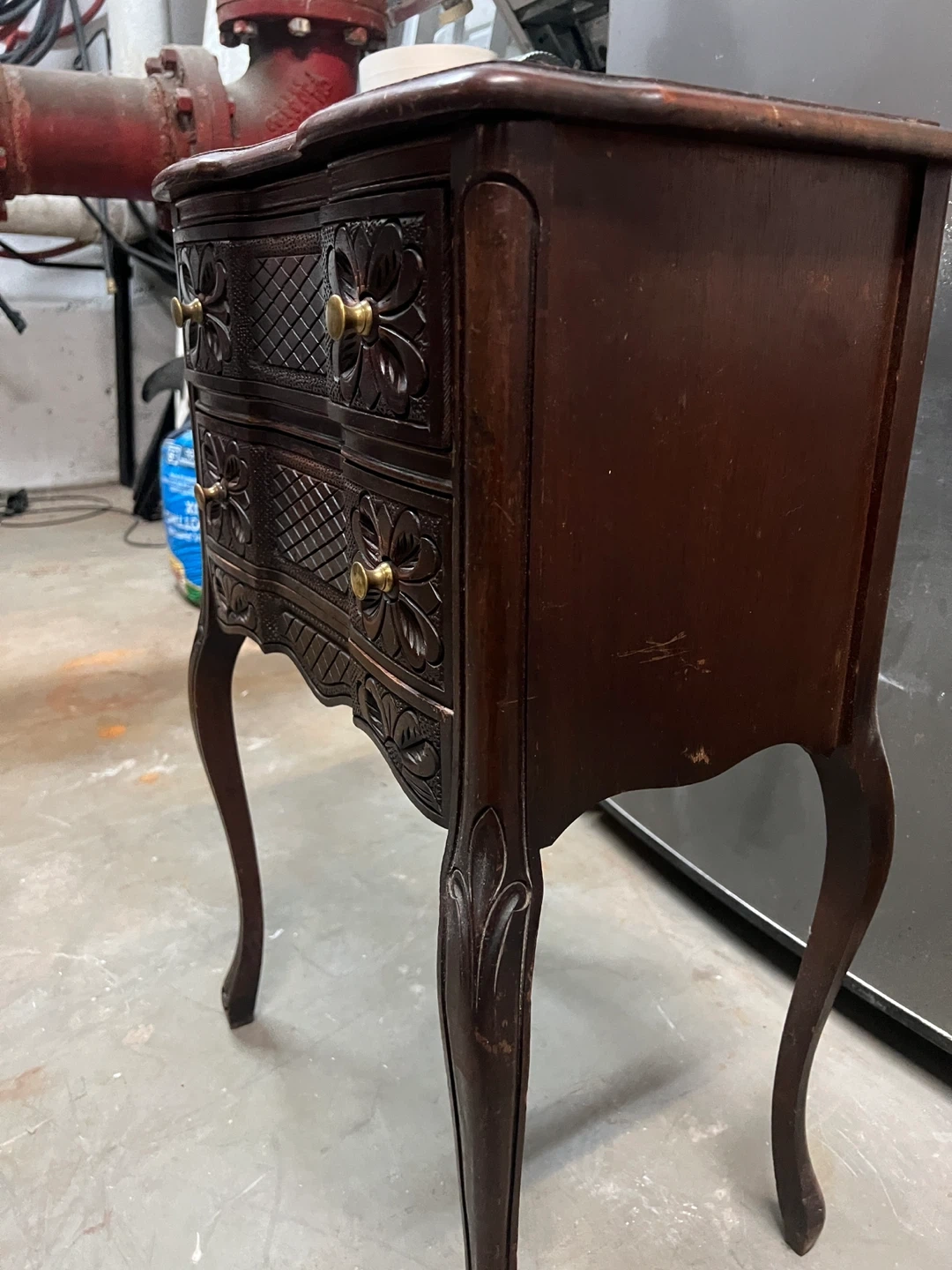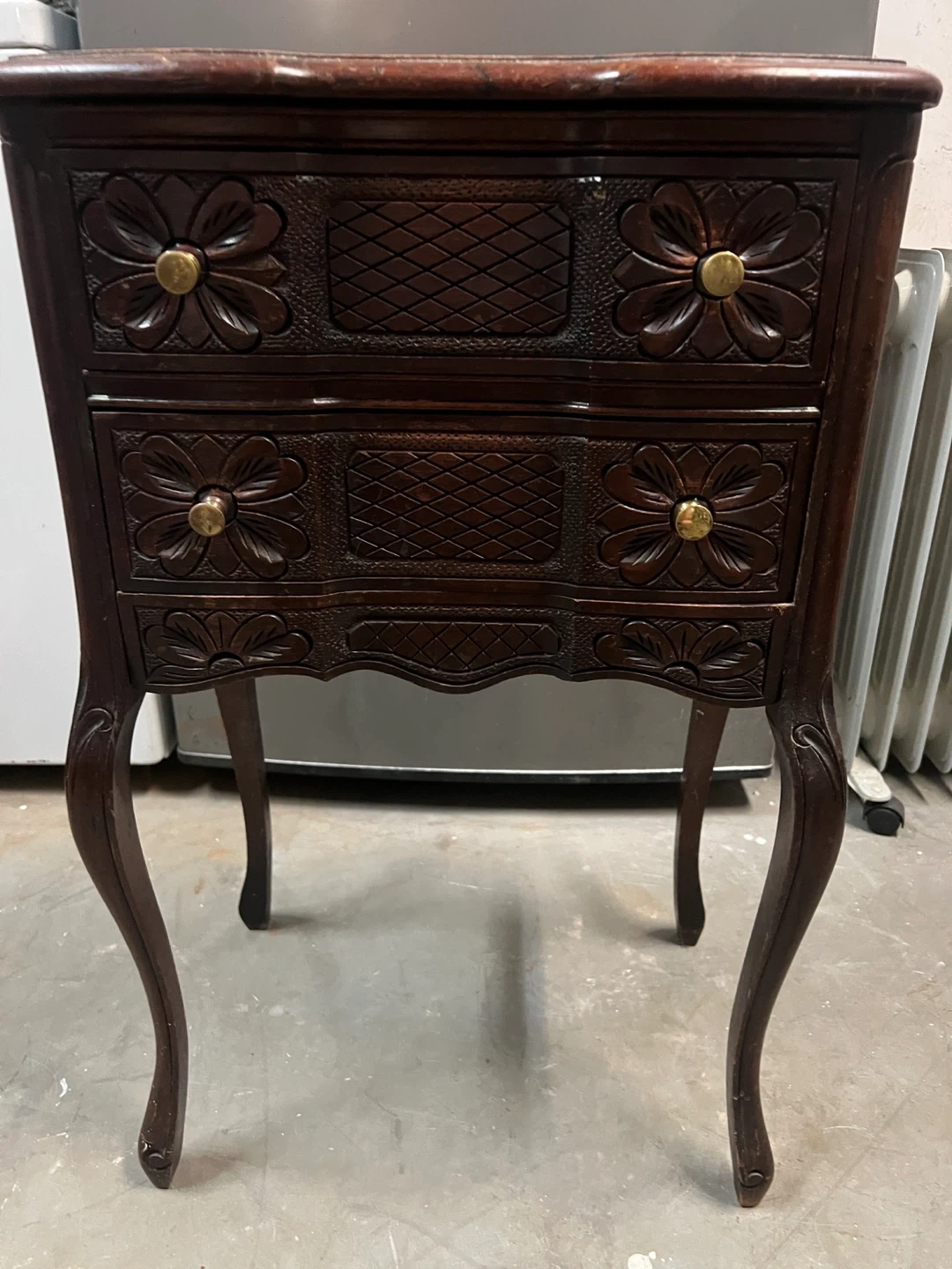 This is a charming antique side table crafted from dark wood. It features intricate floral carvings and two drawers with brass knobs for storage. The cabriole legs add an elegant touch to its design.From 1930s to 1950s era