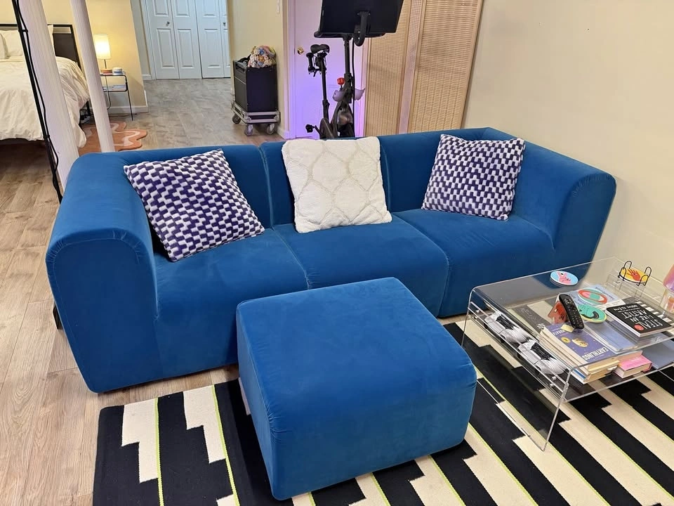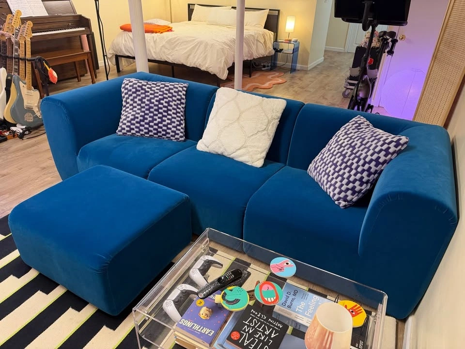 Hi there! I'm selling my couch as I'm moving to a smaller apartment. It's been used for about 8 months and looks brand new. This is a 3-seater modular couch that can be configured in different ways. You can remove the middle seat to create a loveseat and a separate chair. It also comes with a matching ottoman and pillows. The couch breaks down into 3 pieces and the ottoman is 1 piece, making it easier to move. Pick-up is available immediately in Ridgewood, Queens. Accepted payment methods are Cash, Venmo, or Zelle.