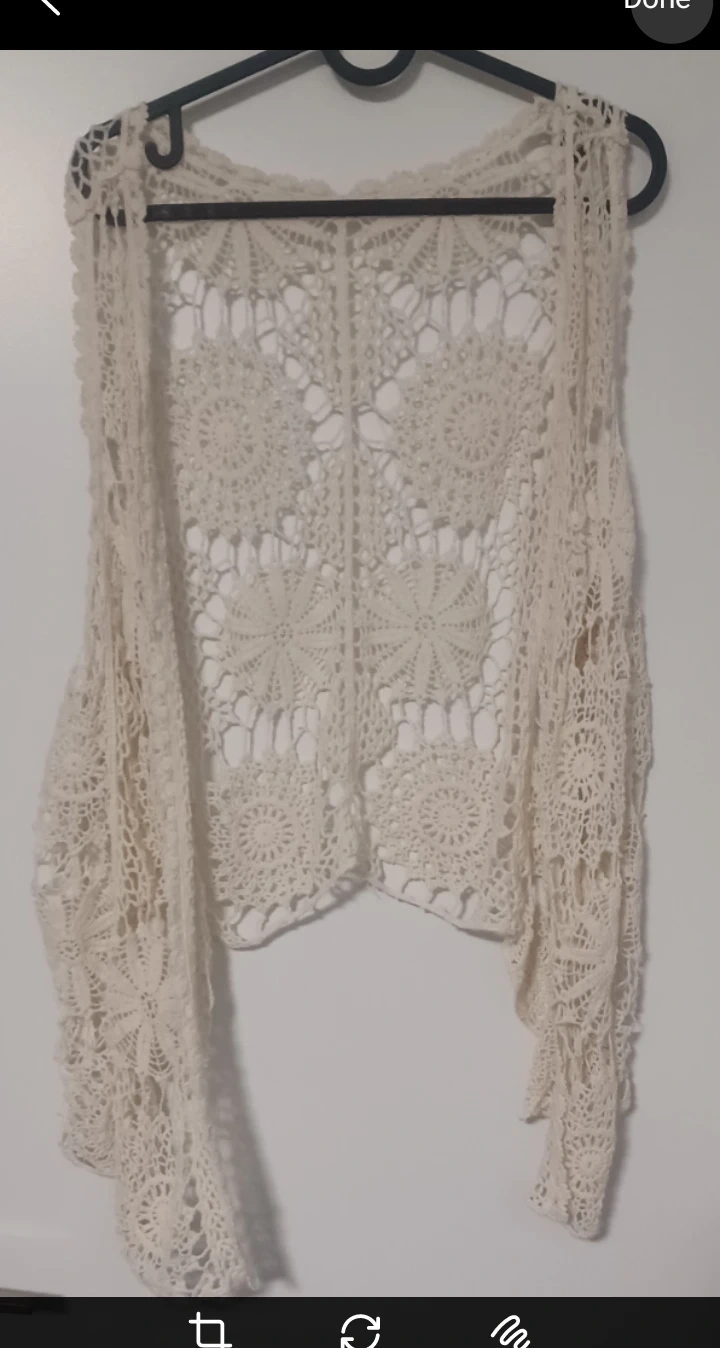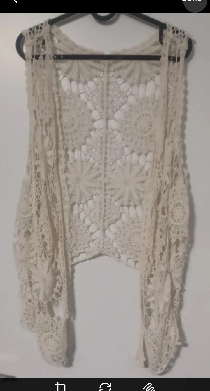 Selling a cream-coloured crochet vest. It's in great condition and would be a lovely addition to any wardrobe! The intricate crochet design adds a unique touch. Wear it backwards and tie the back for a cool look or layer it over any outfit!
