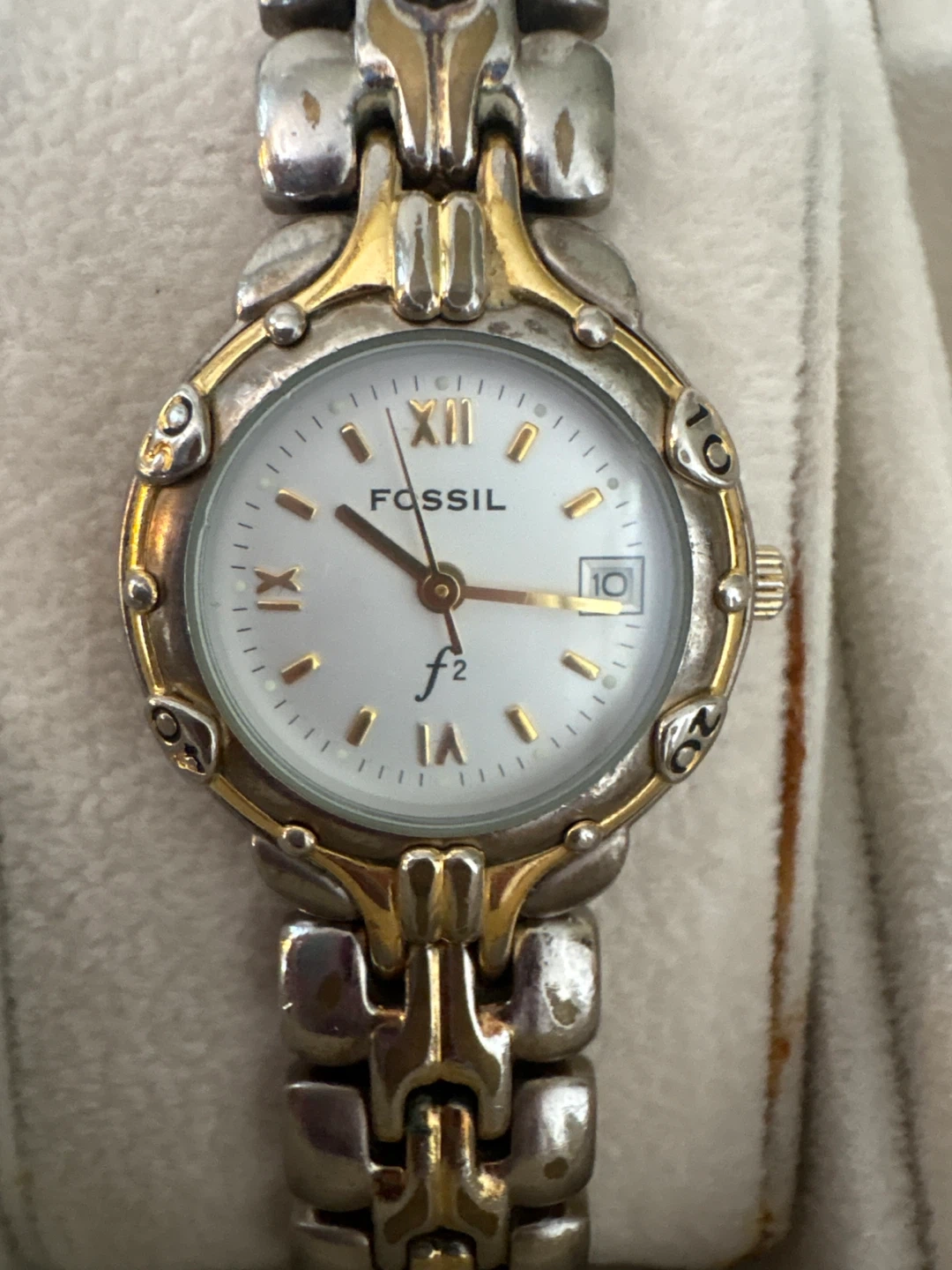 A Fossil watch with a two-tone metal band. It features a white dial with gold-tone hands and markers, and a date display at the 3 o'clock position. The watch combines silver and gold-tone accents.