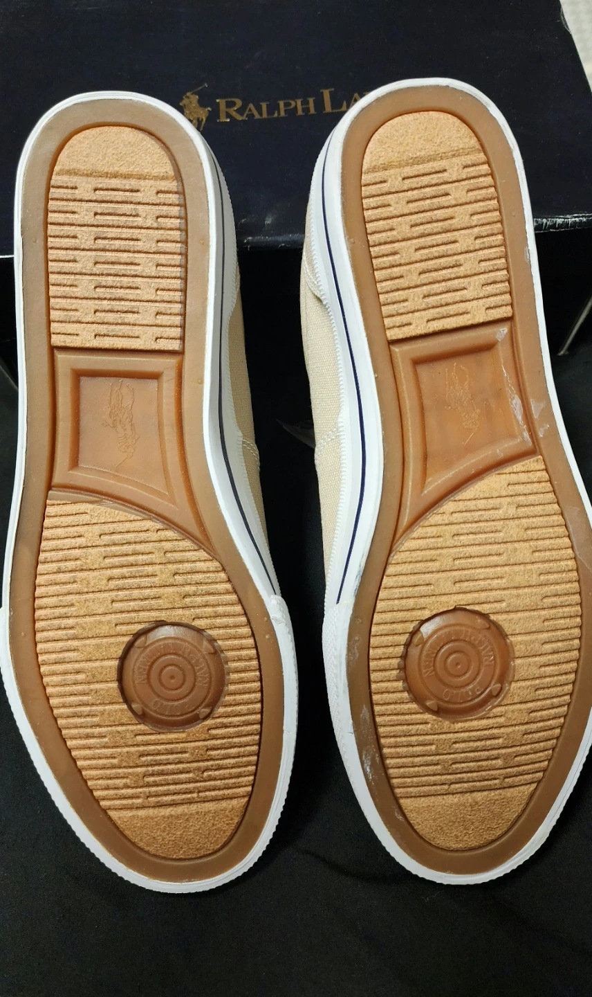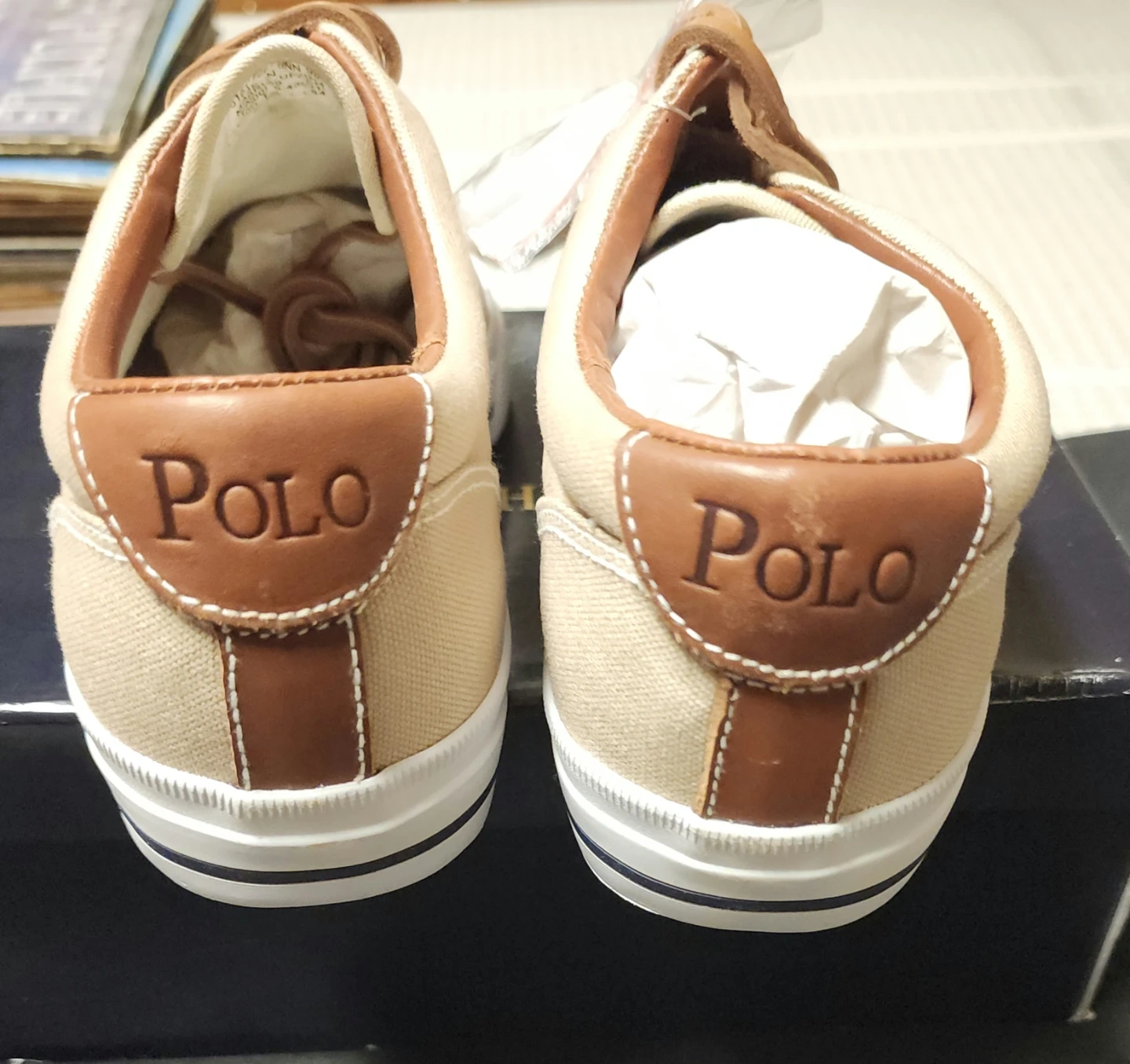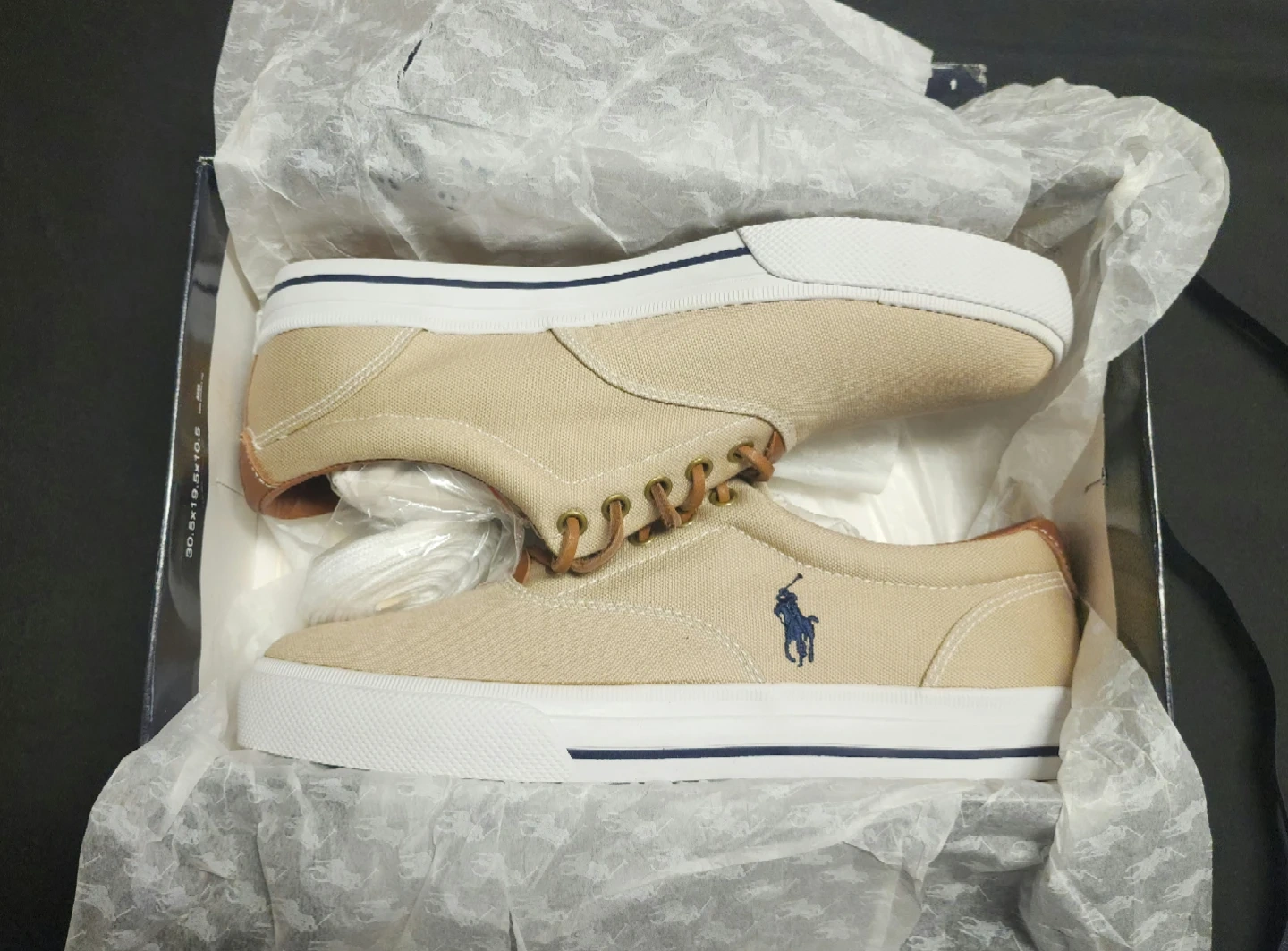 Selling a pair of Polo Ralph Lauren Vaughn sneakers in khaki canvas and leather. They are size 9D and come with the original box. These stylish shoes are perfect for a casual look!