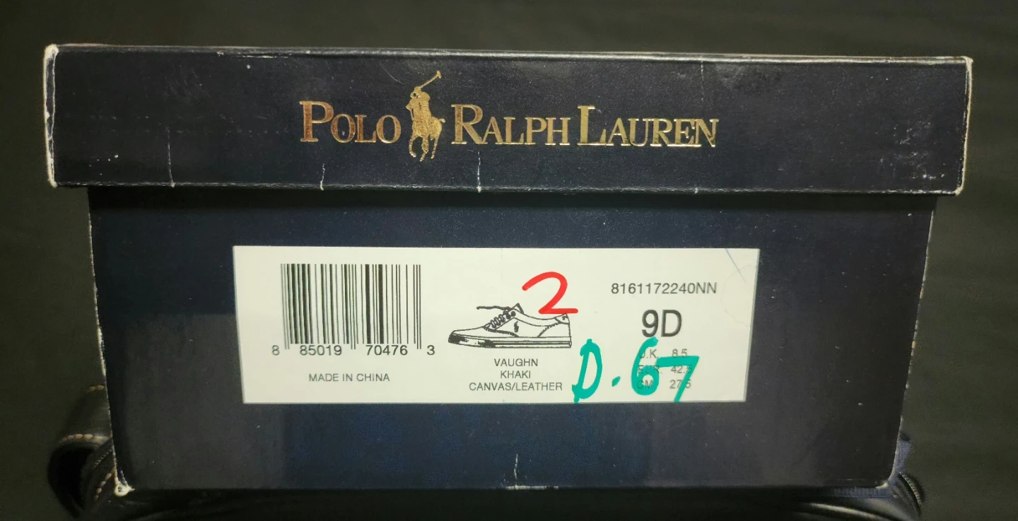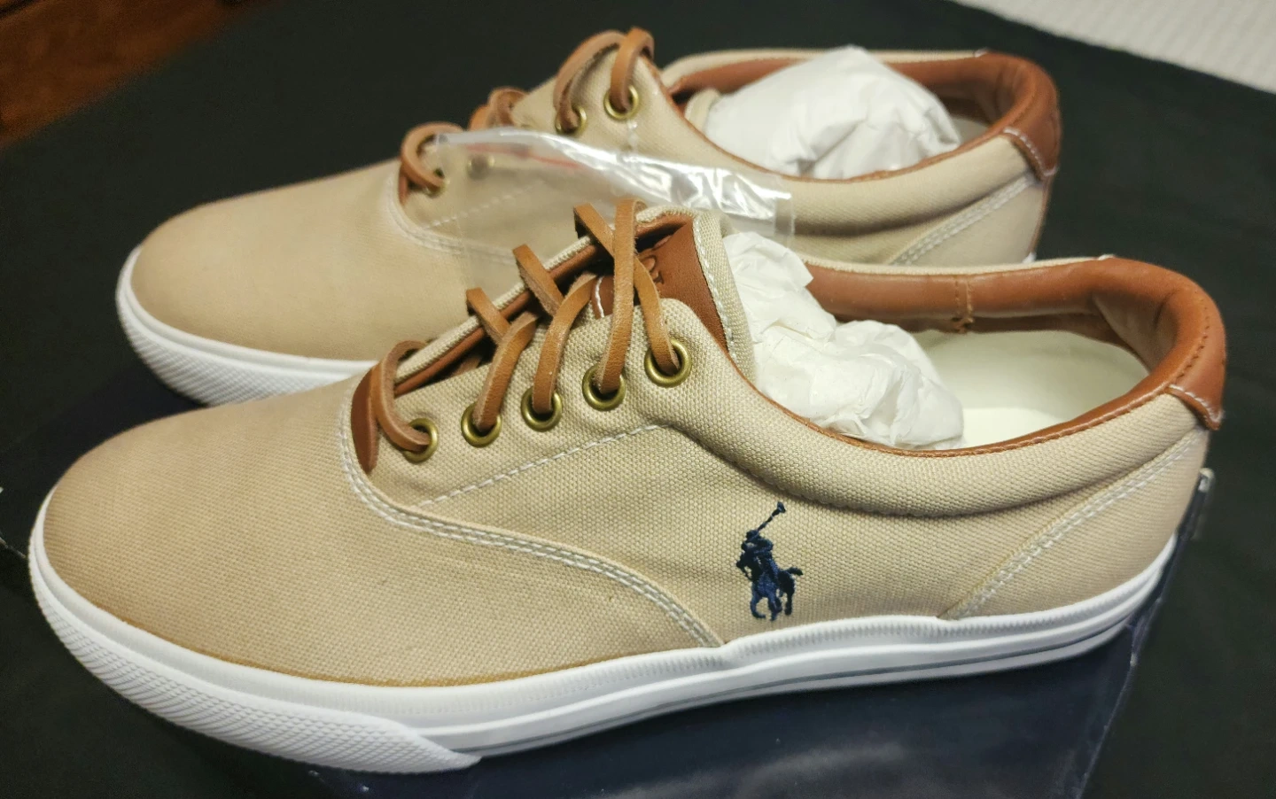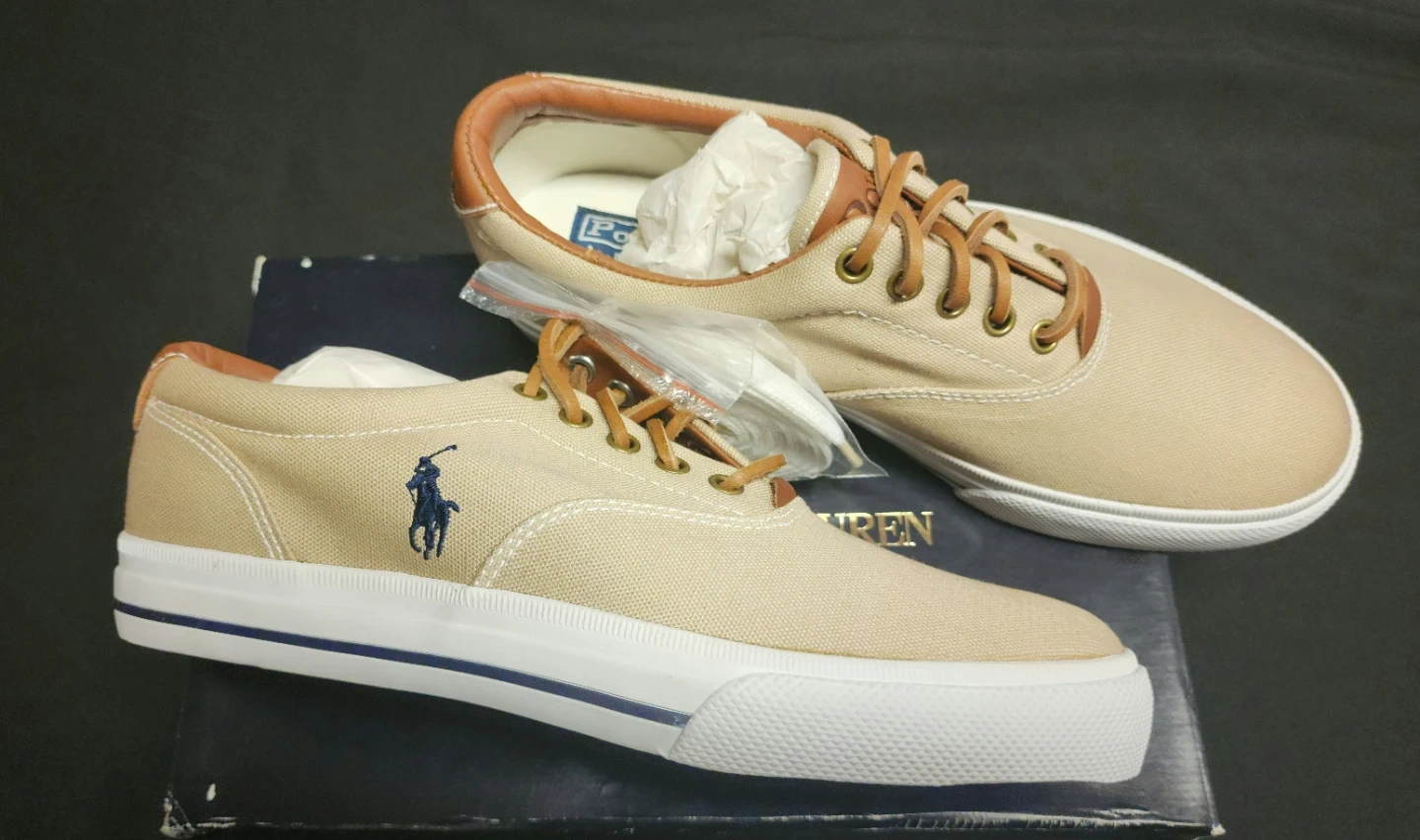 Selling a pair of Polo Ralph Lauren Vaughn sneakers in khaki canvas and leather. They are size 9D and come with the original box. These stylish shoes are perfect for a casual look!