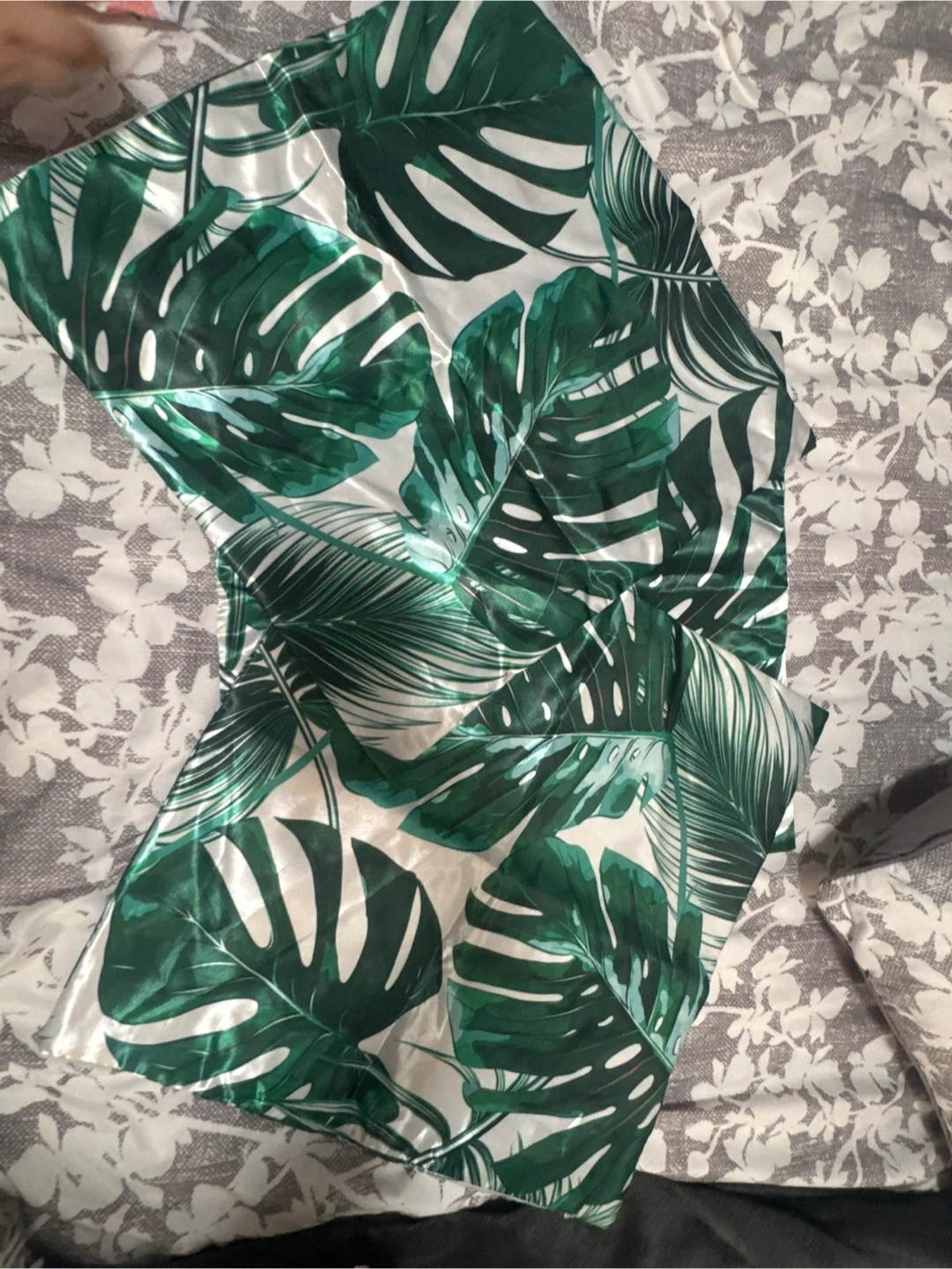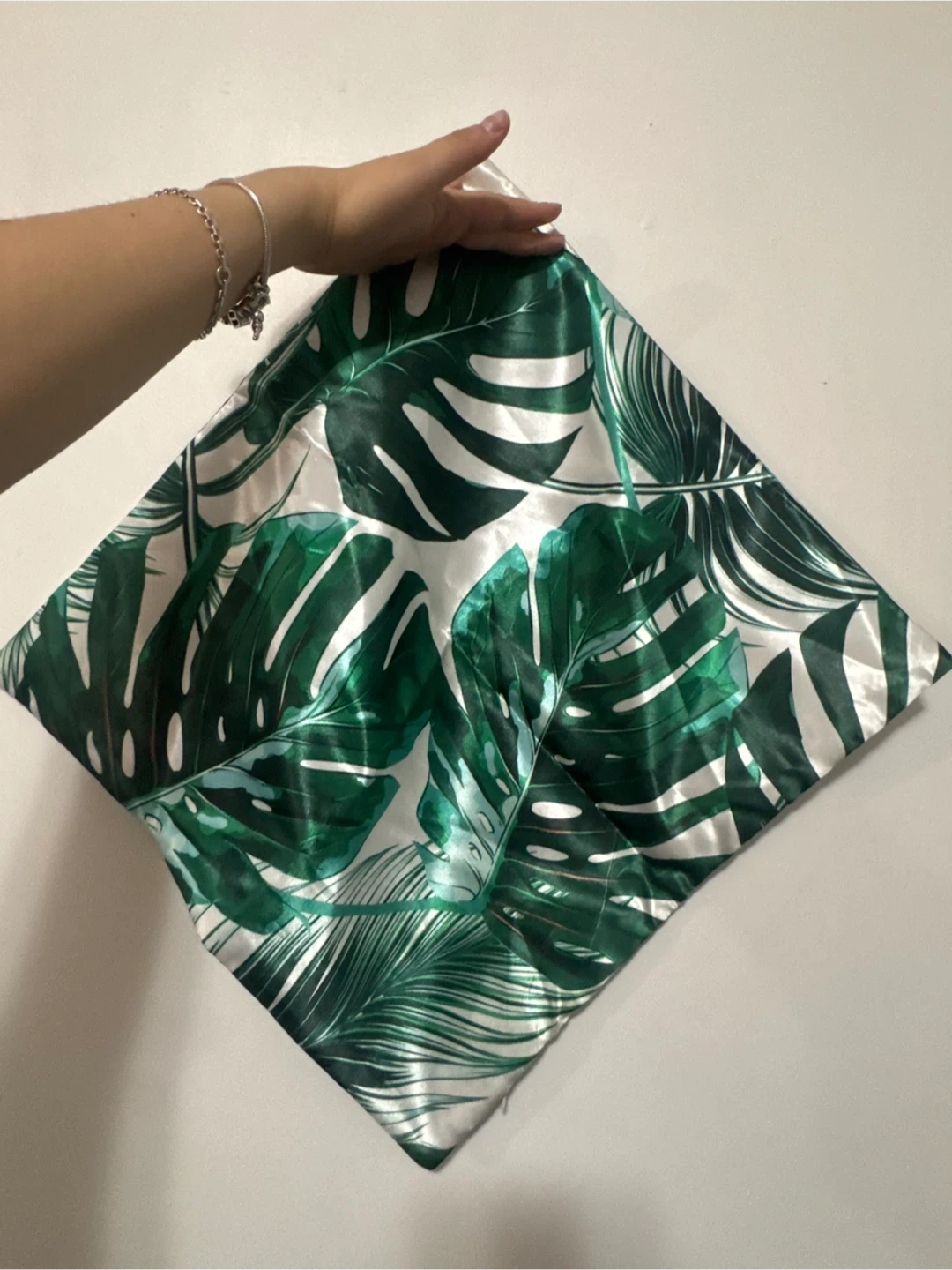 Silky pillow case with a vibrant monstera and palm leaf print.