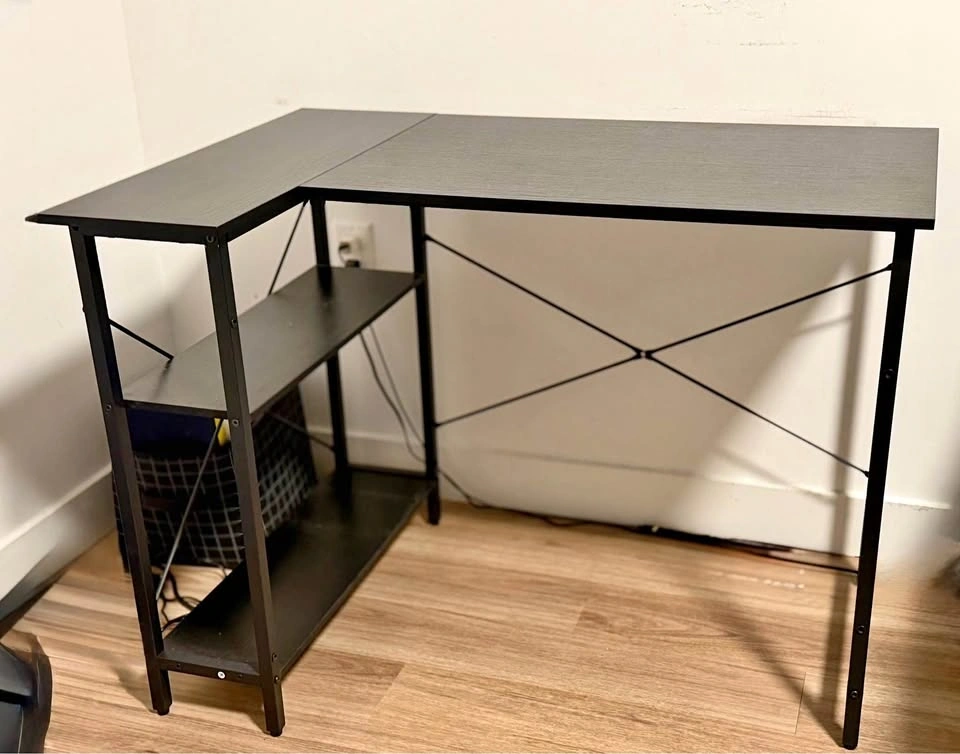 This L-shaped desk offers a spacious 55-inch surface, perfect for your home office setup. It includes built-in storage shelves to help keep your workspace organized. Feel free to message if you have any questions!