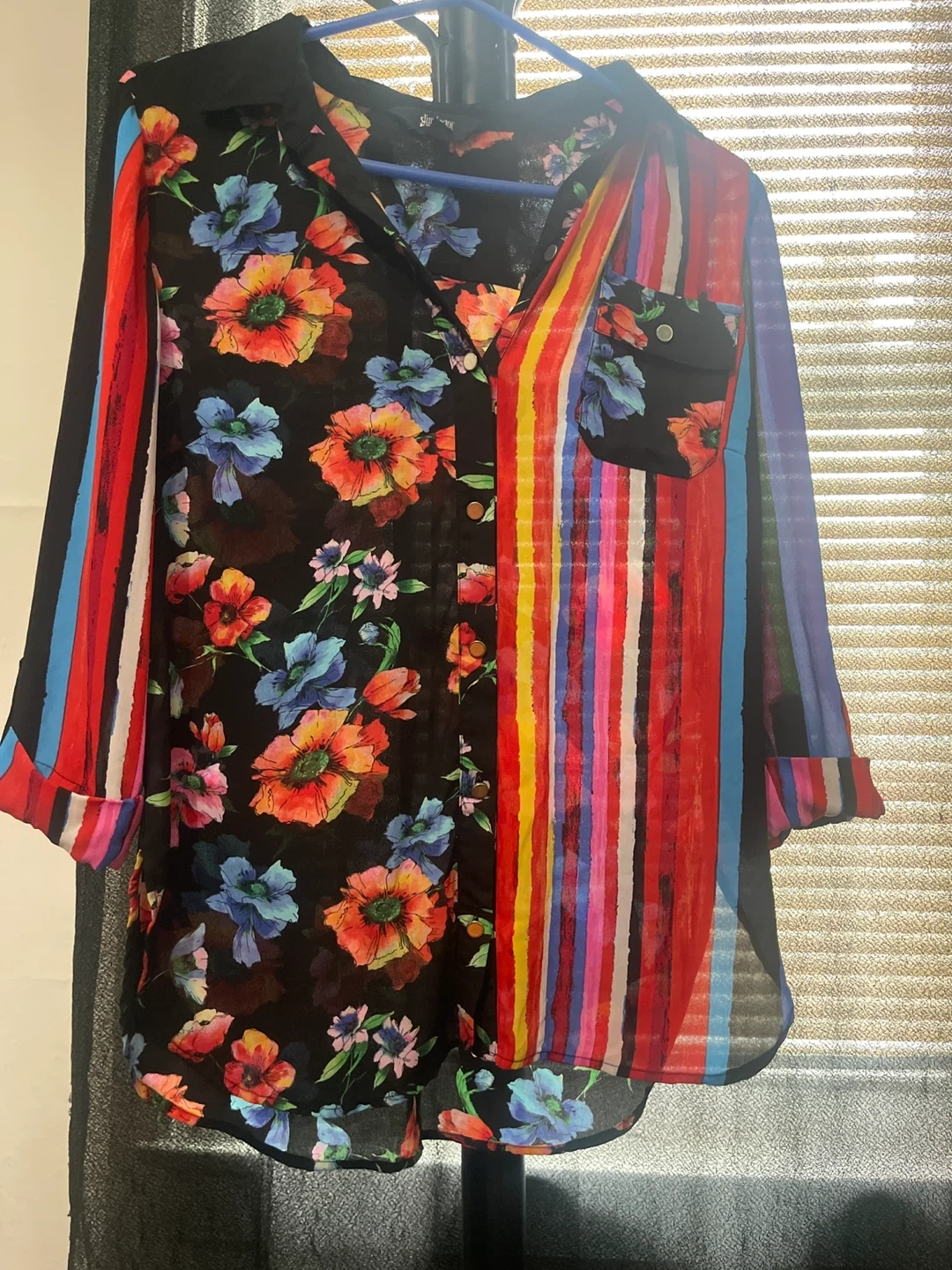 This women's sheer button-up shirt features a bold design. It has a floral print on one half and colorful vertical stripes on the other. The lightweight material makes it perfect for layering.