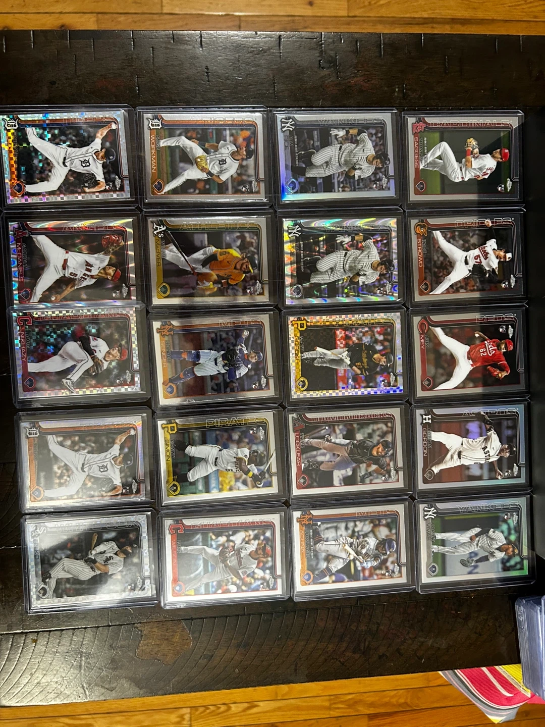 Lot of various Topps Chrome baseball cards featuring different MLB players. Cards are in protective sleeves and cases. Features include various teams and players like Workman, Strowd, and Gordon.