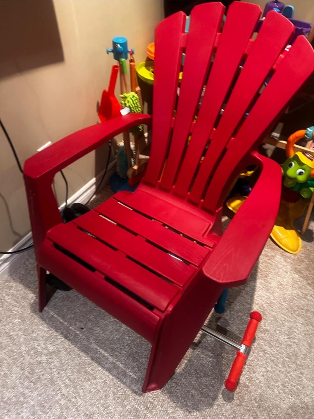This is a bright red Adirondack adult chair. It's strong and sturdy, made of durable plastic material. Great for relaxing outdoors and as patio chair.
