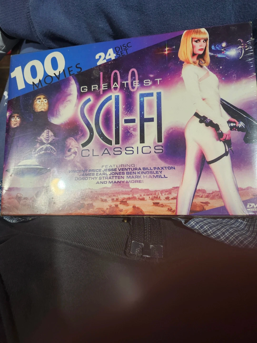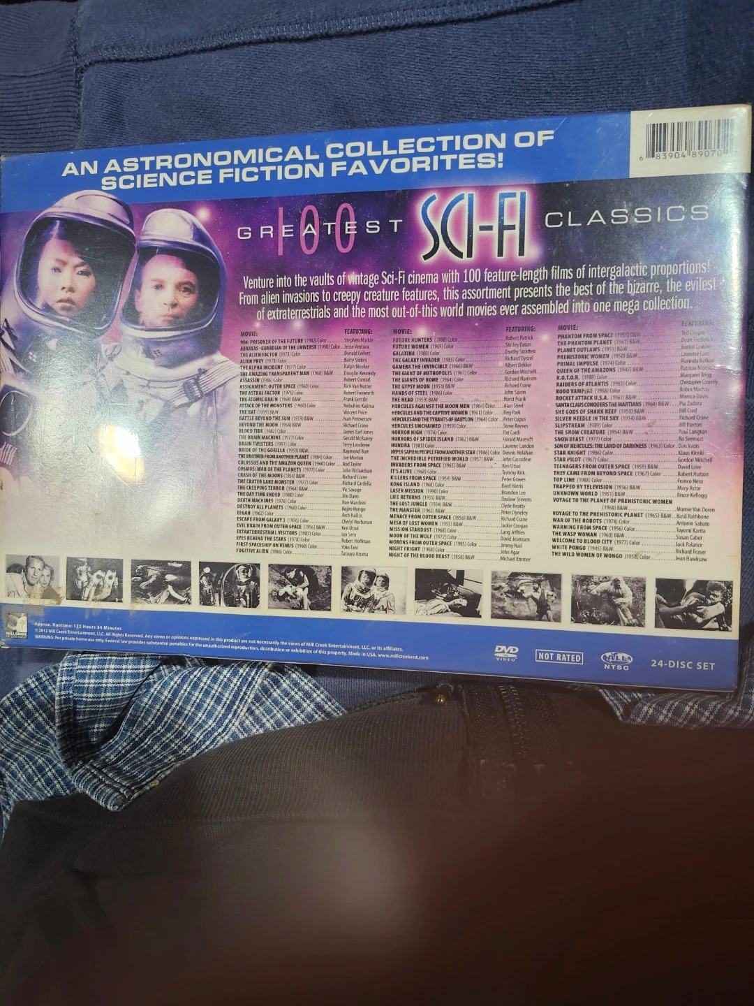 Selling a 24-disc set of 100 Greatest Sci-Fi Classics! This collection features an astronomical collection of science fiction favorites. Venture into the vaults of vintage Sci-Fi cinema with 100 feature length films of intergalactic proportions! From alien invasions to creepy creature features, this assortment presents the best of the bizarre, the evillest of extraterrestrials and the most out-of-this-world movies ever assembled into one mega collection