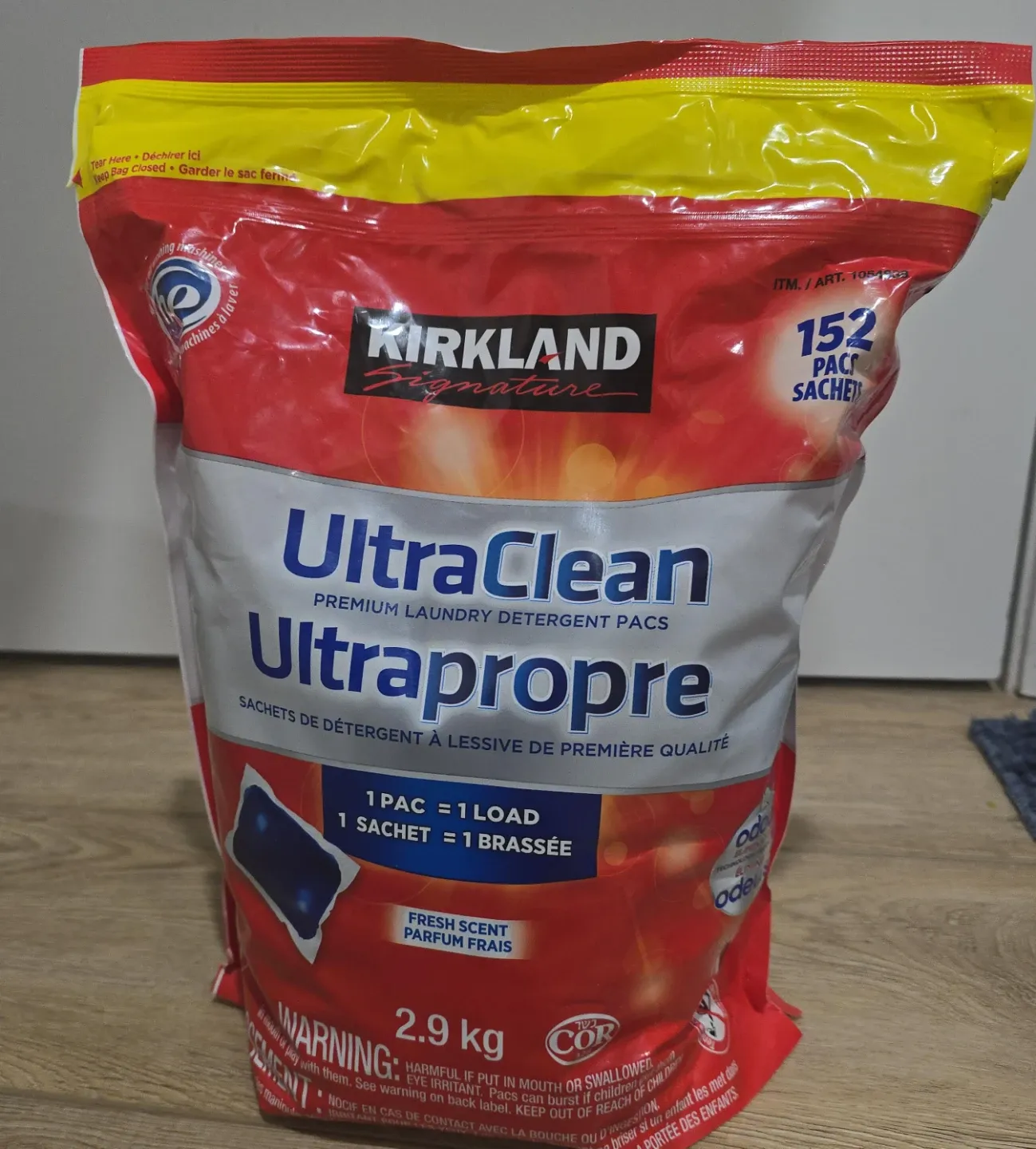 Kirkland Signature Ultra Clean laundry detergent pacs in Ultrapropre formula. It's a fresh scent and comes with 152 sachets. Each pac equals one load of laundry. This bag contains 2.9 kg of detergent pacs.