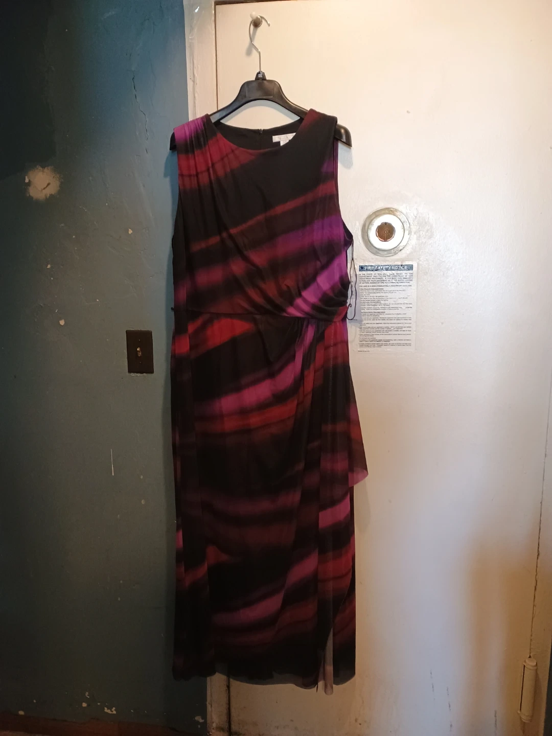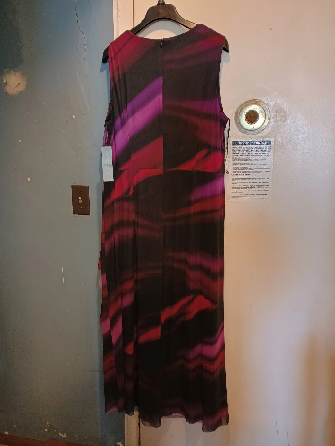 This sleeveless dress features a vibrant abstract print in shades of black, pink, and red. It has a draped front detail and a midi length. The fabric is lightweight and flows nicely.