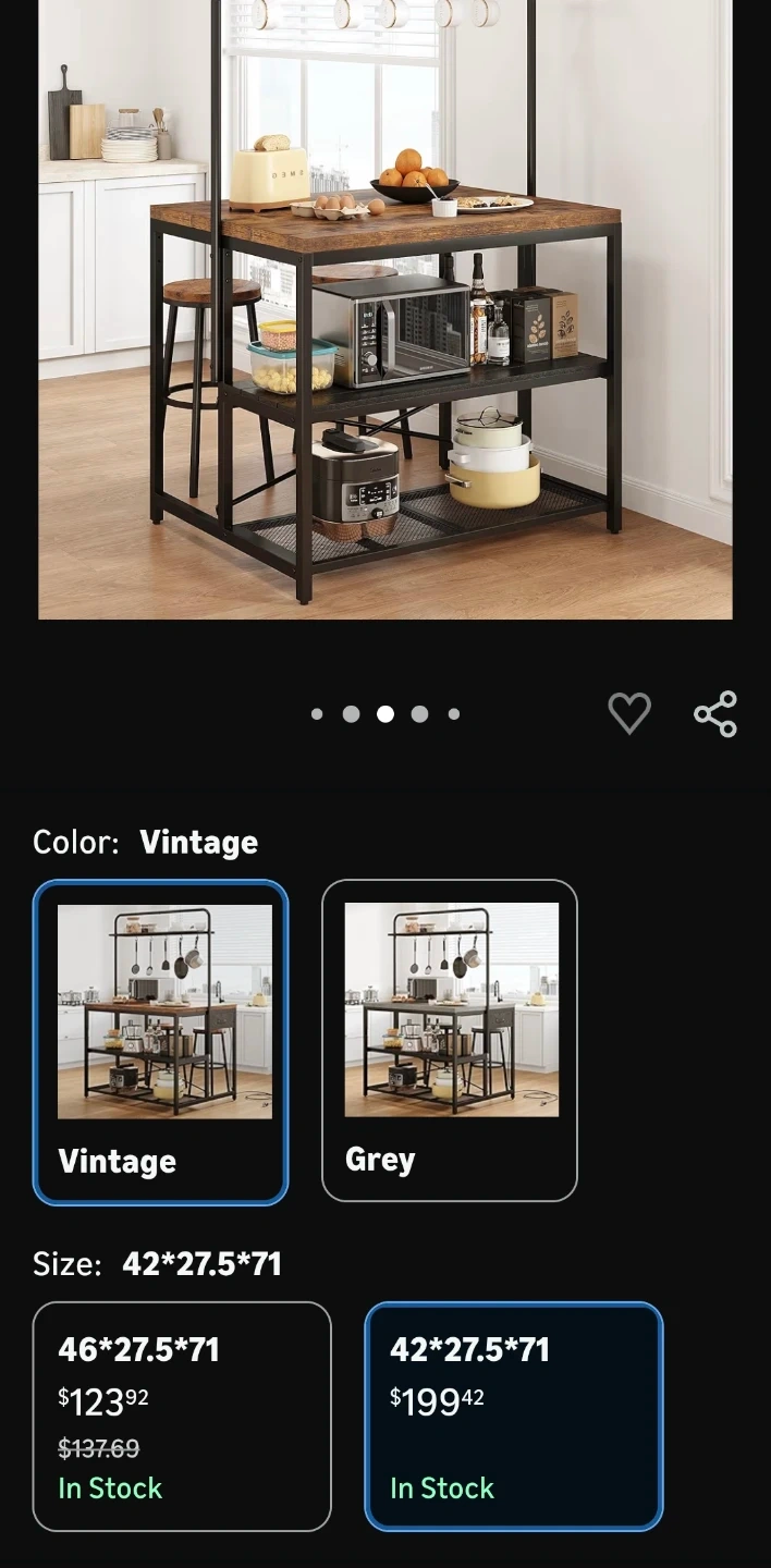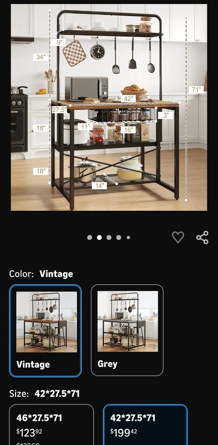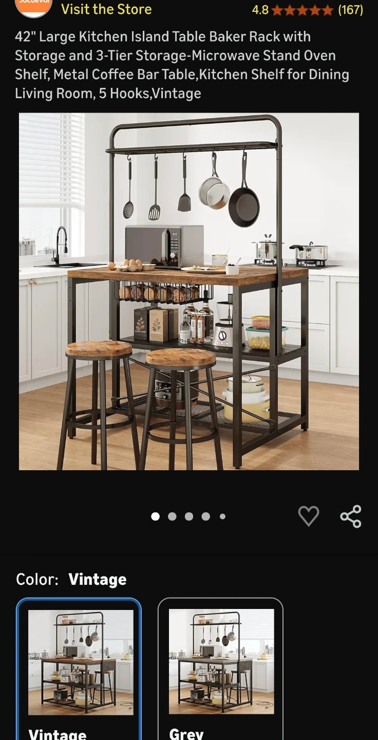 This 42" kitchen island table features a baker rack design with storage and 3-tier shelves. It includes a microwave stand oven shelf and 5 hooks. The vintage color fits well in a dining room or living room.