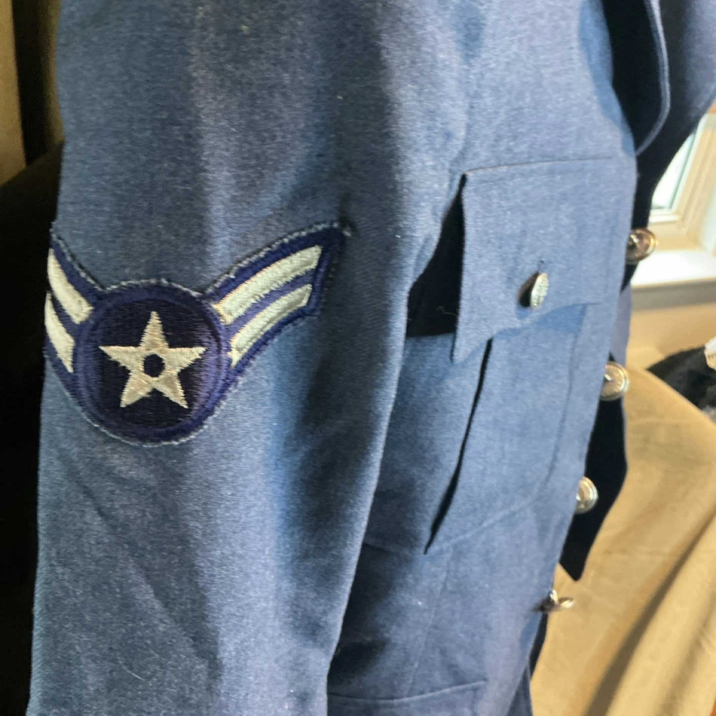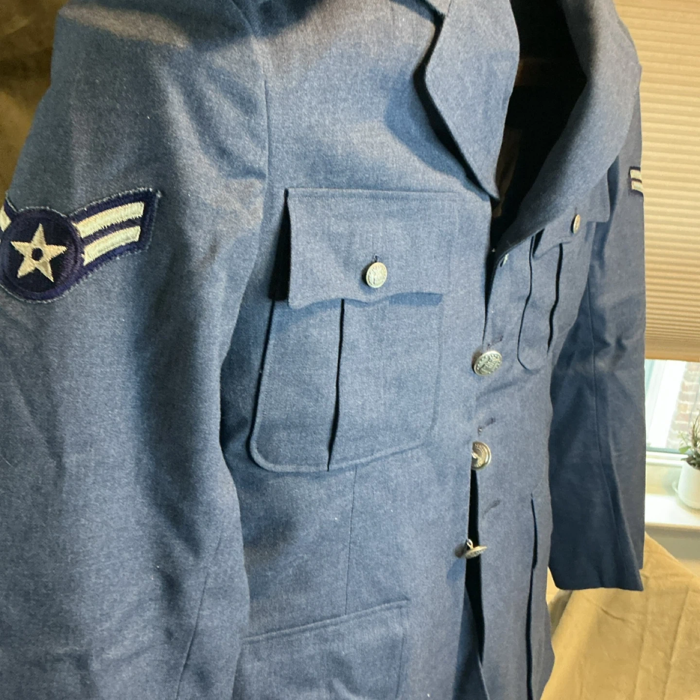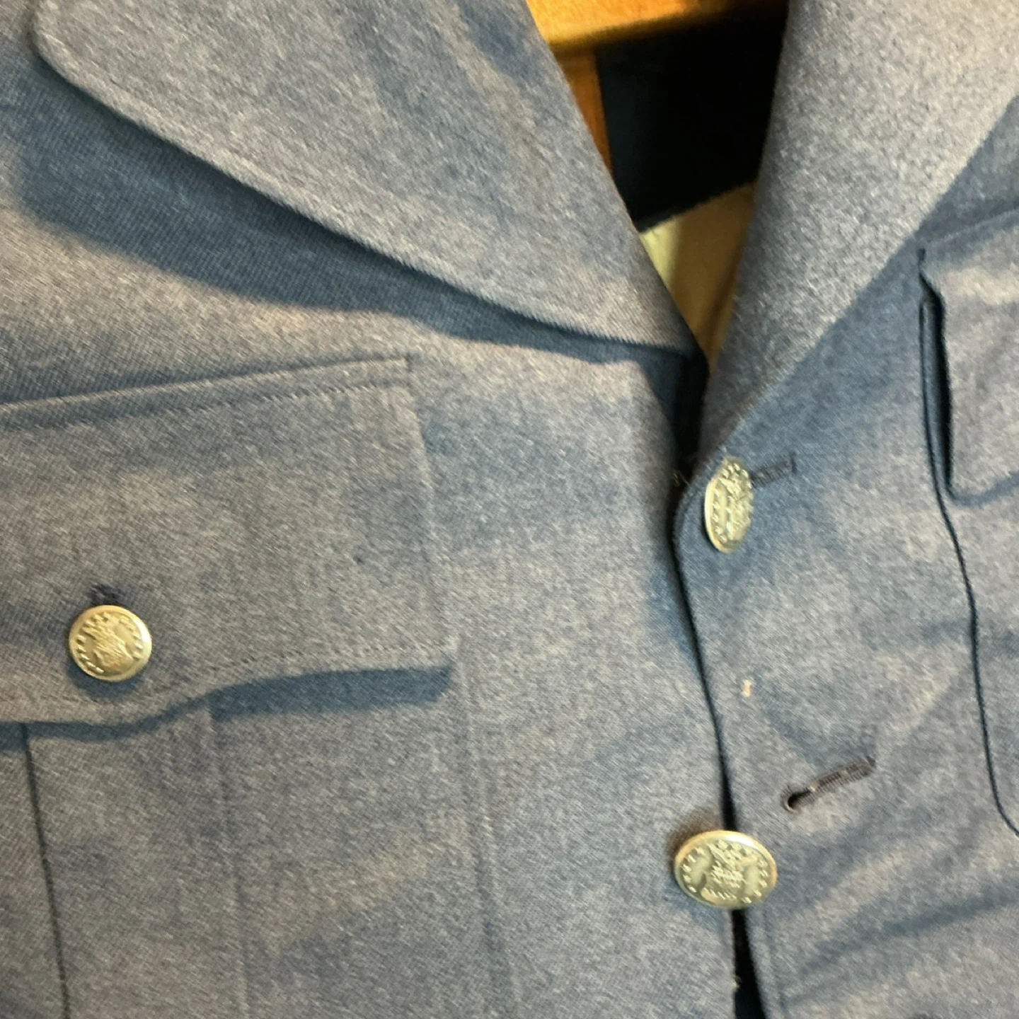 This set includes a vintage blue Air Force uniform jacket and matching pants. The jacket features two chest pockets and two hip pockets with button closures. A size tag reads '41'. Great collectible piece of military clothing