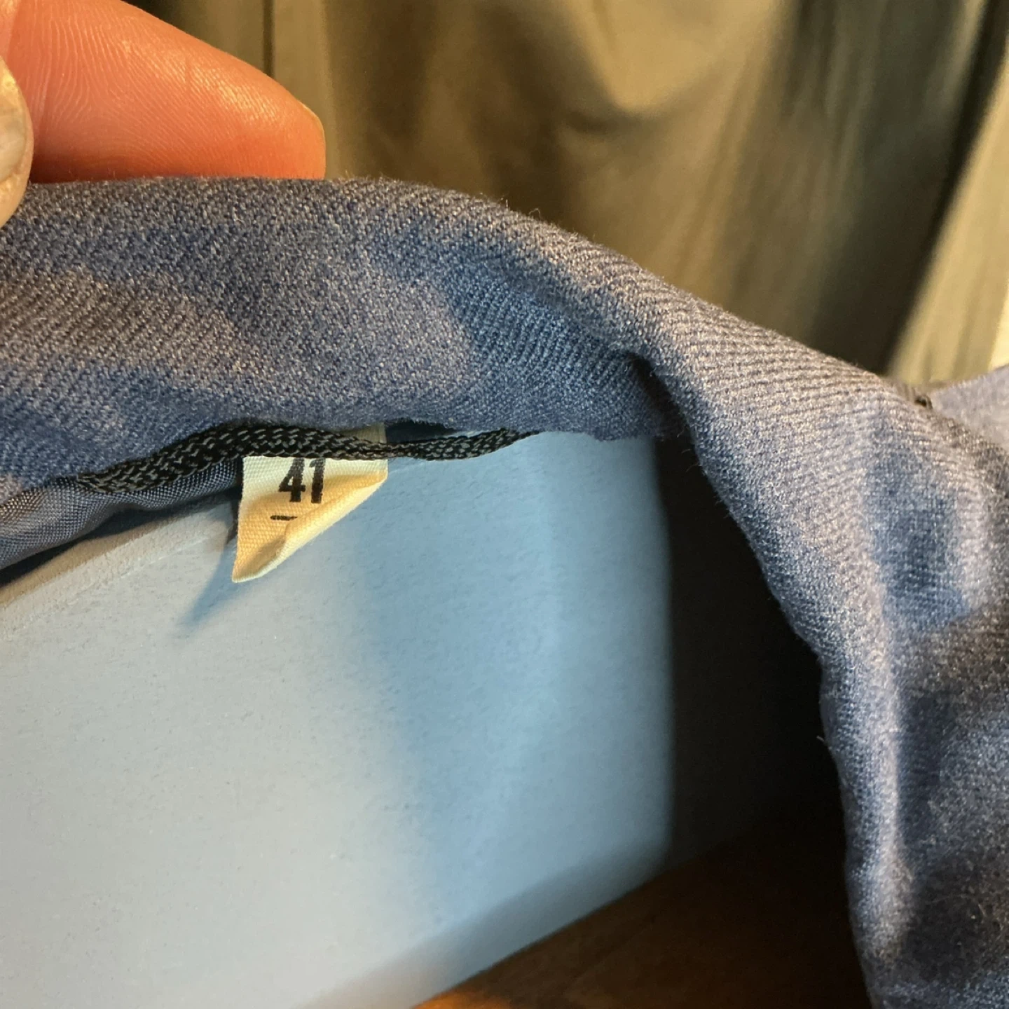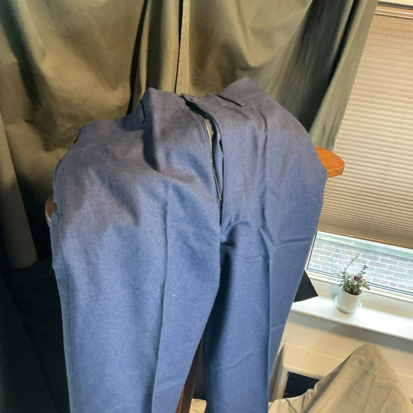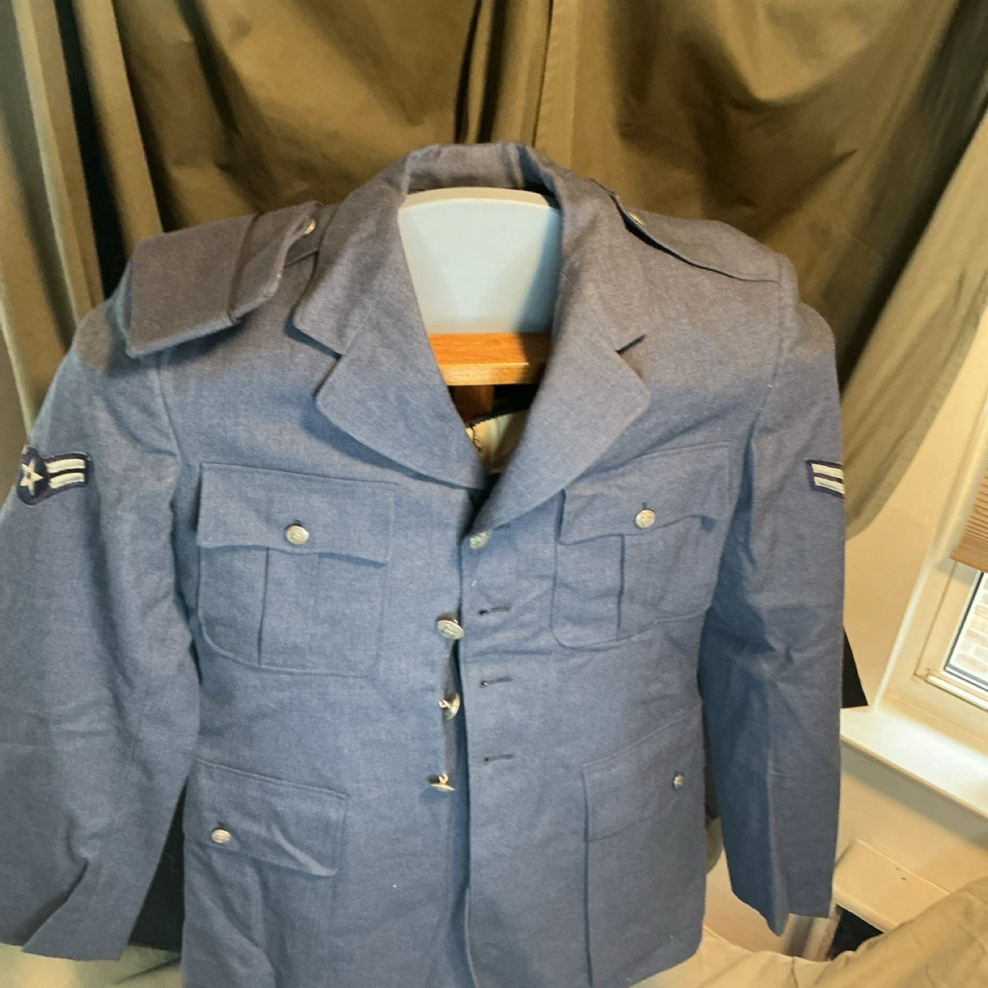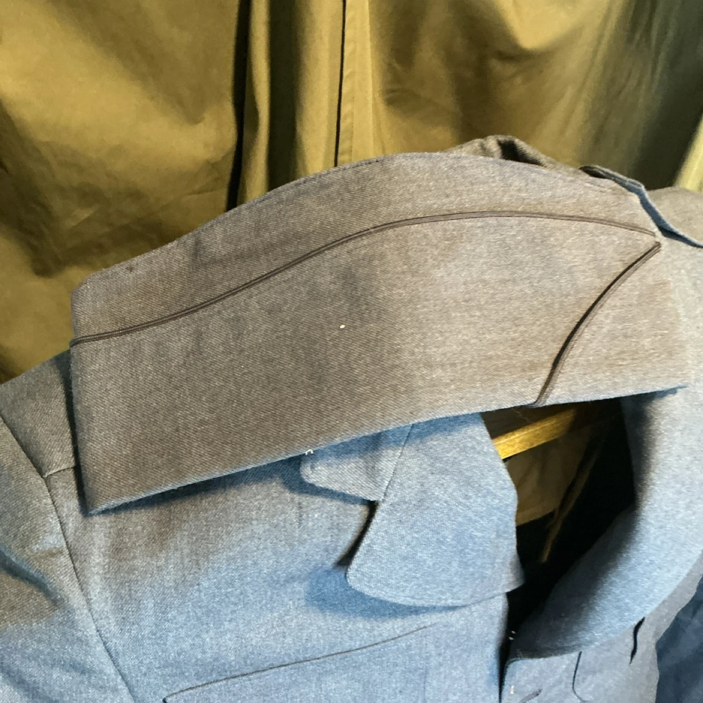 This set includes a vintage blue Air Force uniform jacket and matching pants. The jacket features two chest pockets and two hip pockets with button closures. A size tag reads '41'. Great collectible piece of military clothing